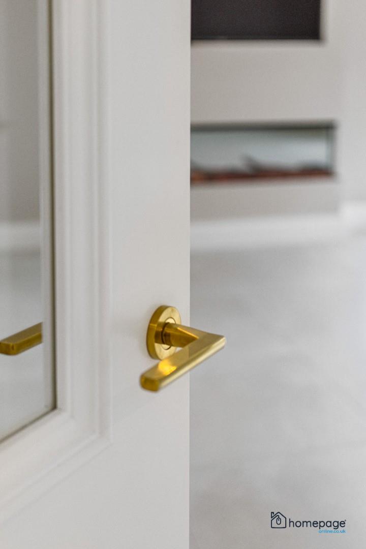 Solid timber 2 panel doors with gold handles, painted off white architraves and skirting.