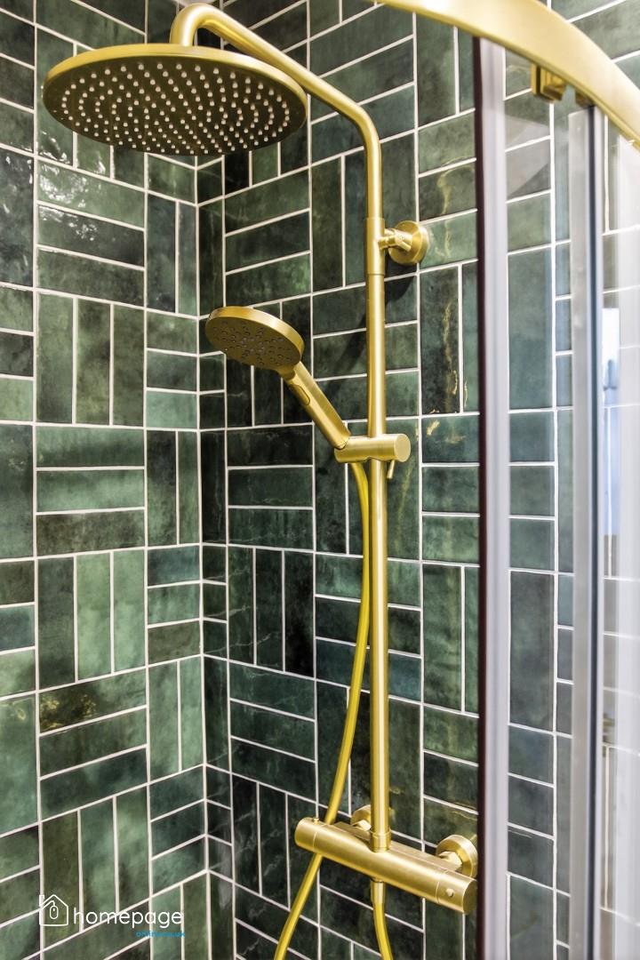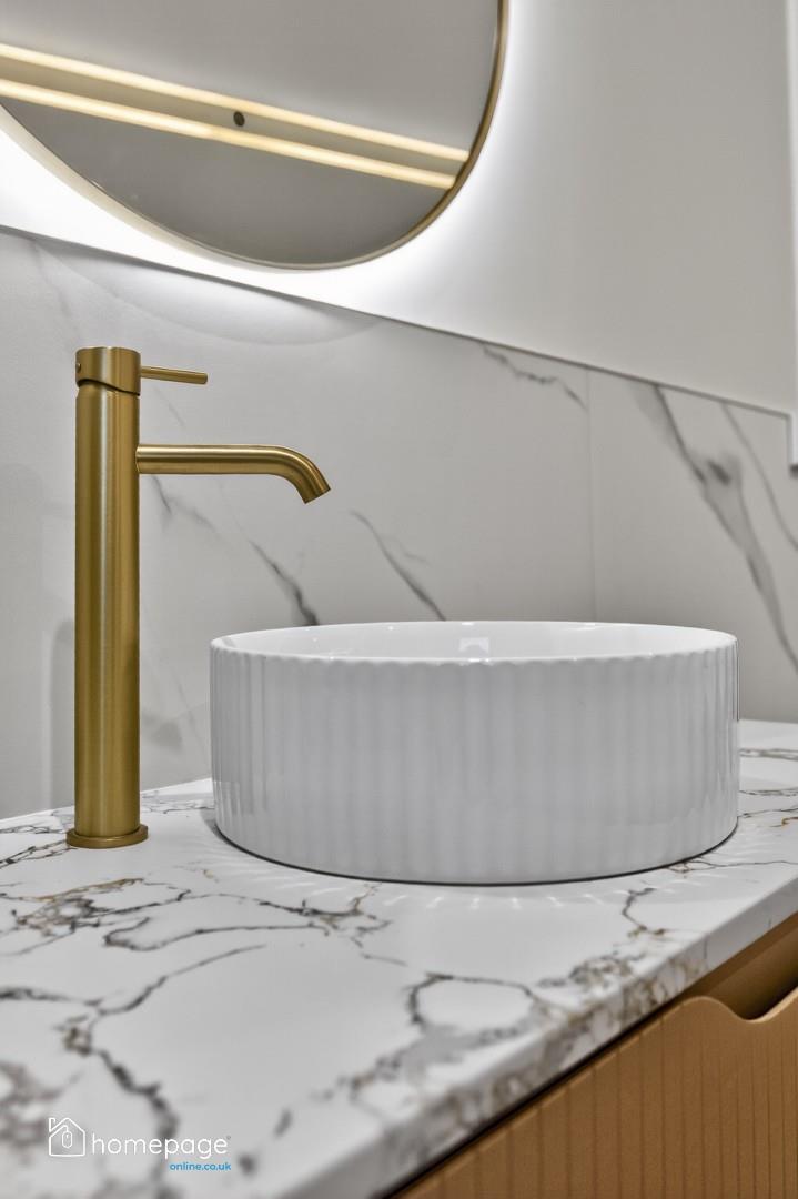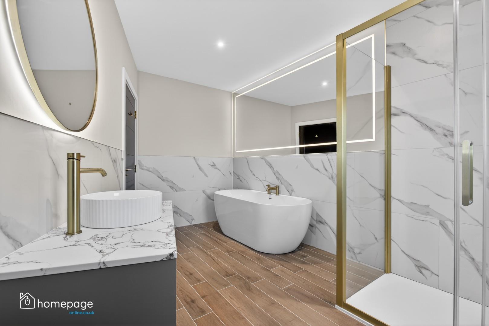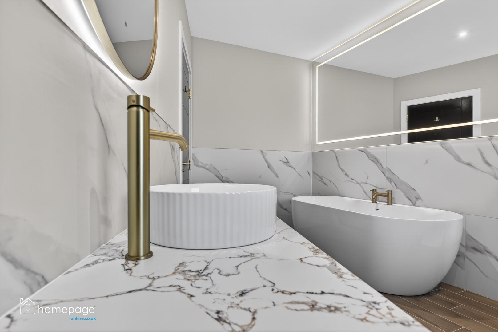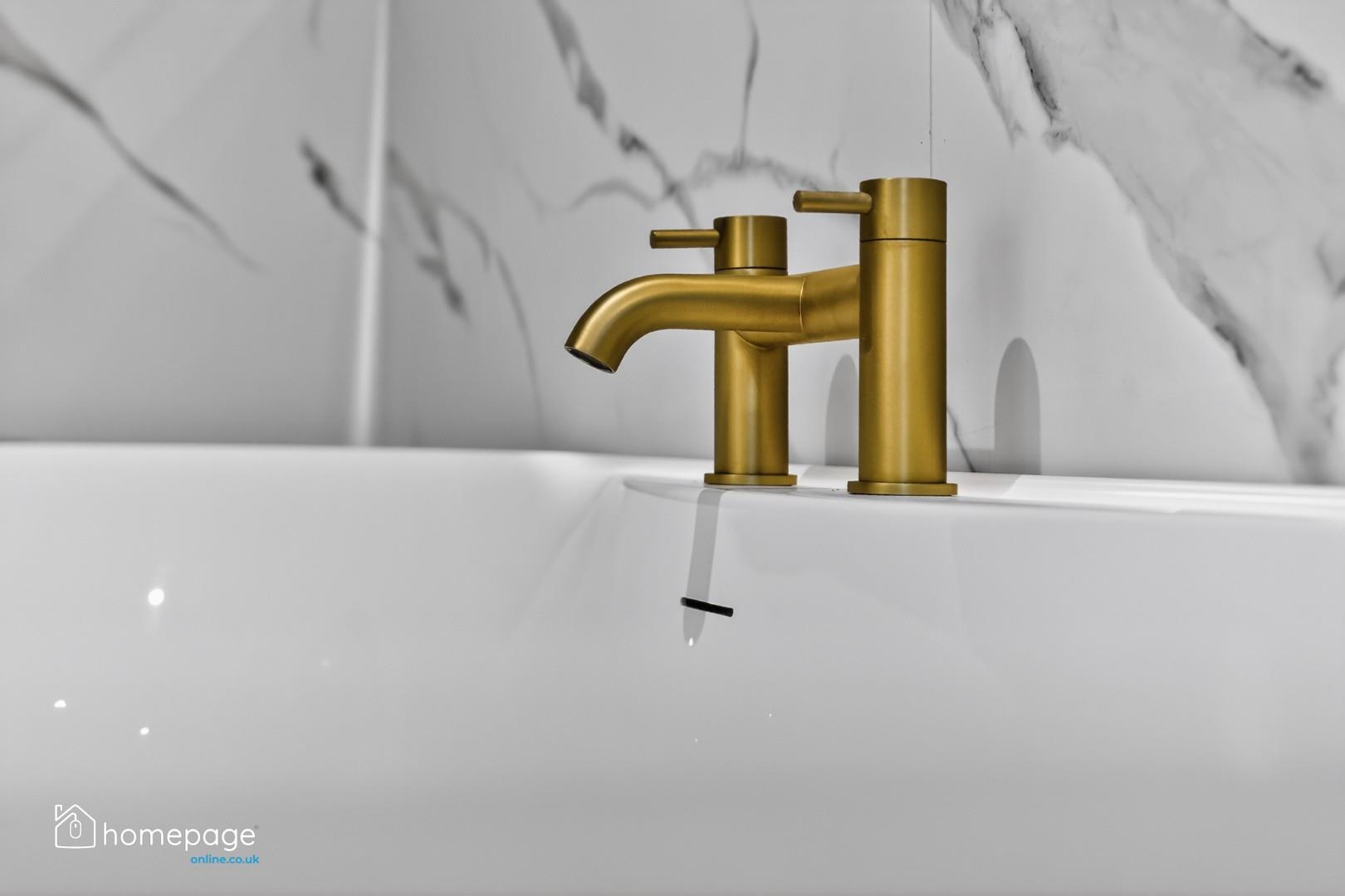 Thermostatically controlled free standing bath with gold ironmongery.