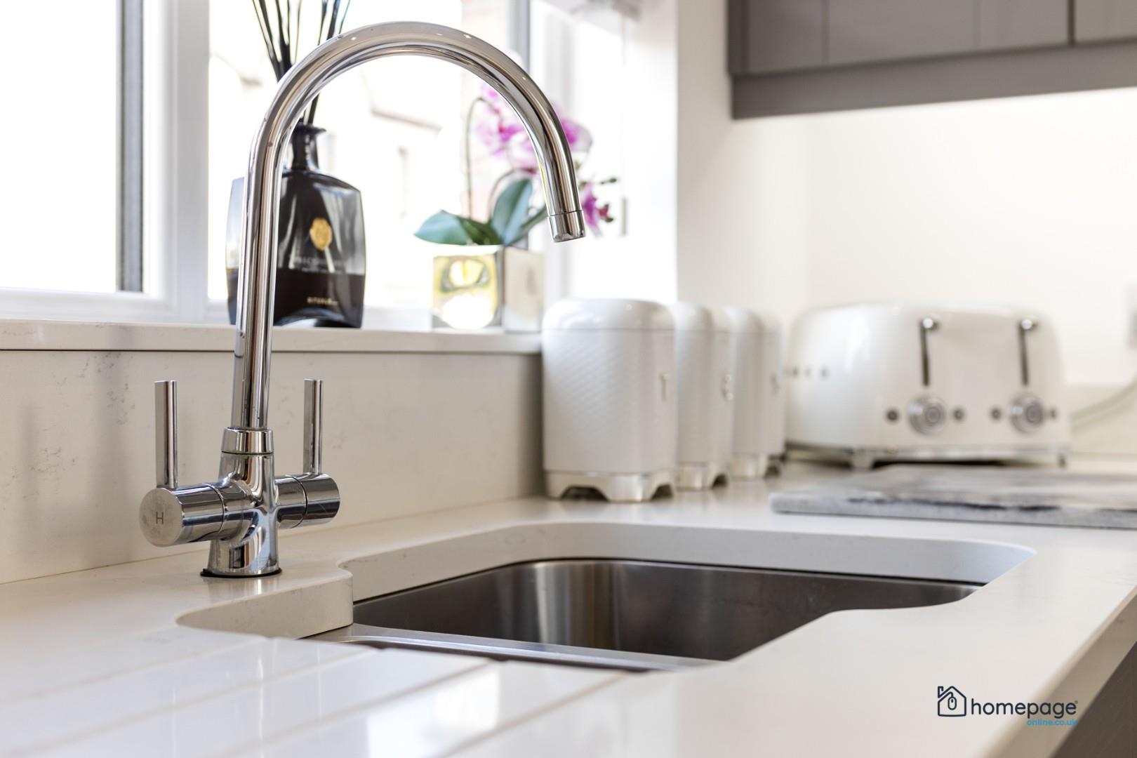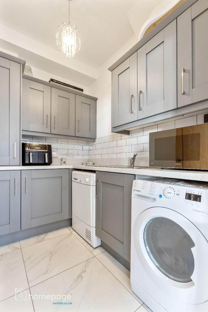 The convenient Utility room has ample space with a wide range of high and low level storage, provision for washing machine and dryer, sink and wall tiling
