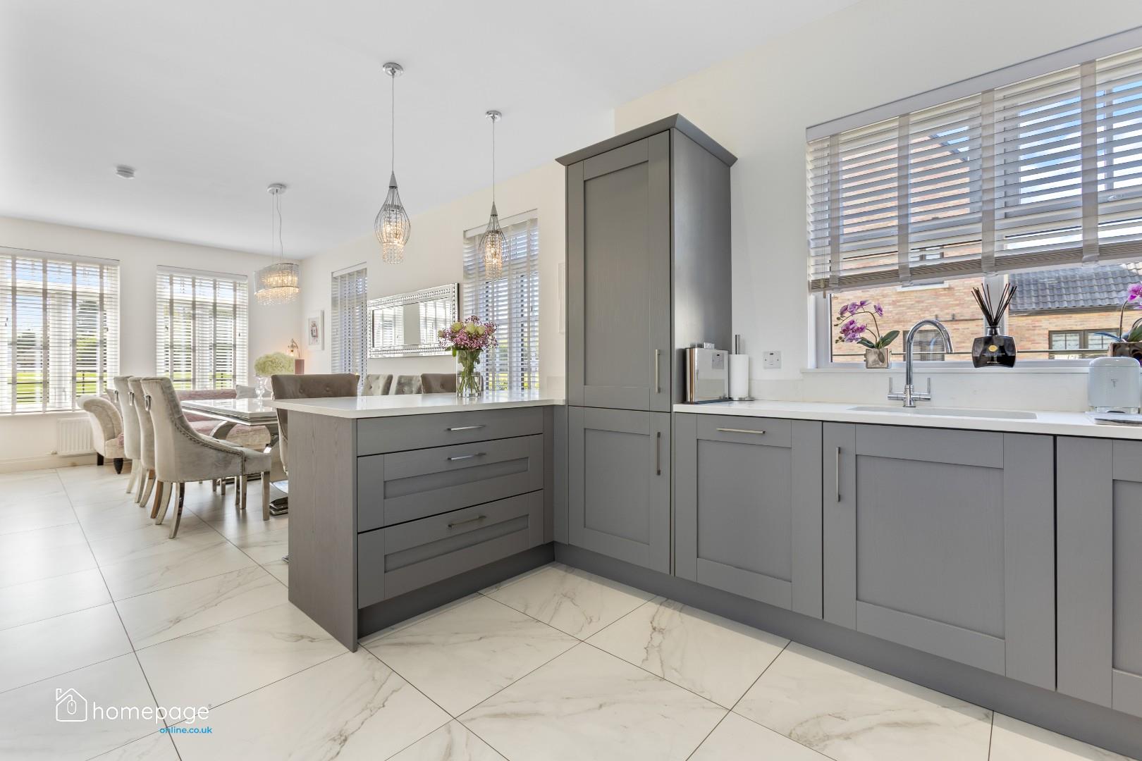 The large open plan kitchen / dining space is fitted with a wide range of high and low level storage , solid wood 4 piece doors, quartz worktops with quartz upstand & splashback, electric hob , high level ovens, integrated dishwasher, feature breakfast bar with seating and feature lighting, high quality tiling and spot lights throughout.