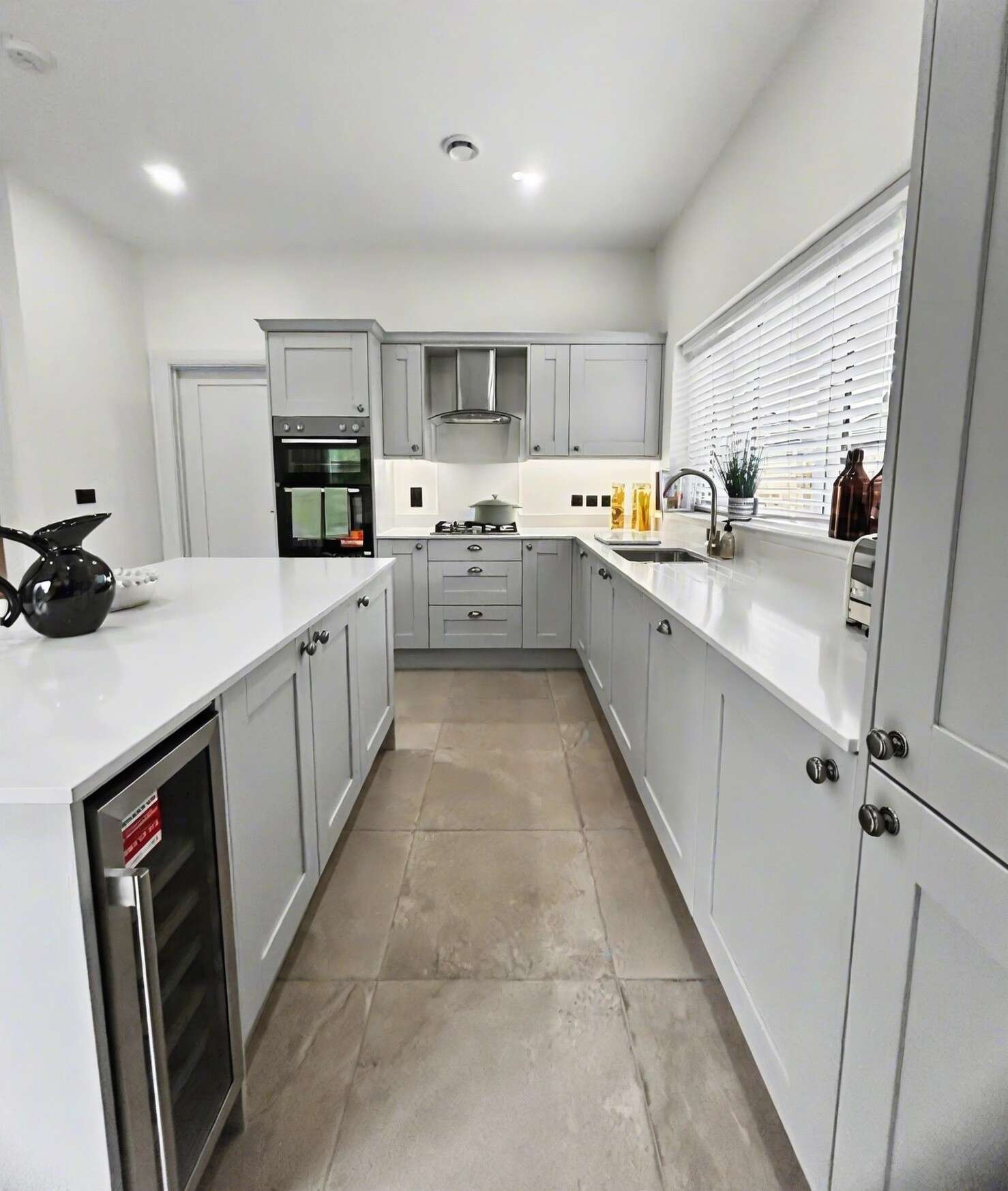 The heart of the home is the stunning open-plan kitchen and dining area, complete with a central island and ample space for a dining table seating six. Integrated appliances include a wine fridge, dishwasher, and fridge freezer, while the adjoining utility room offers further storage, fitted washing machine, space for a tumble dryer, enclosed boiler housing, and direct access to the rear garden. A generously sized under-stairs storage cupboard provides excellent practicality for family living.