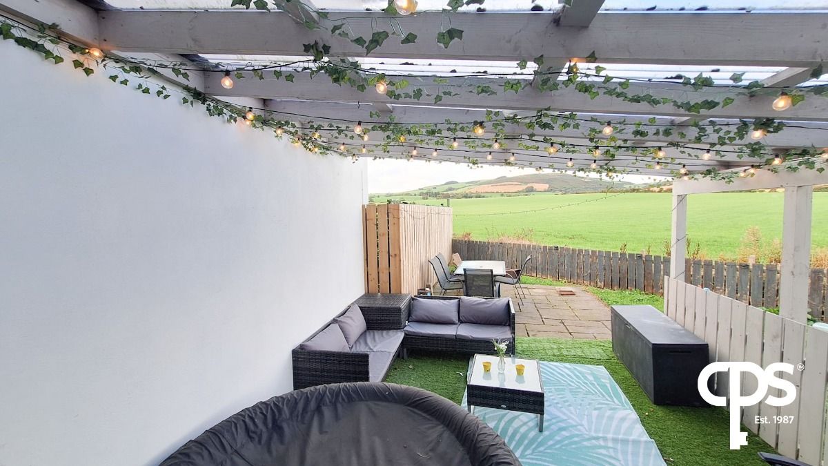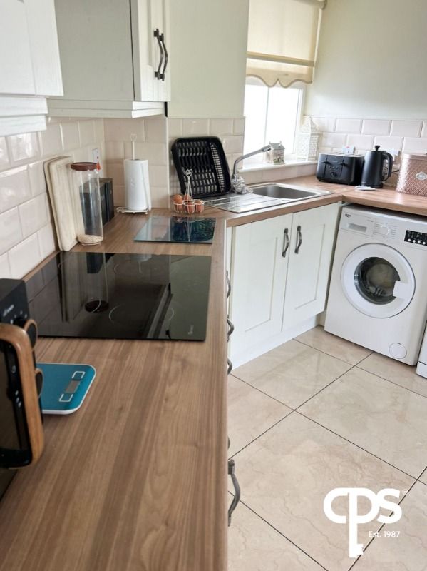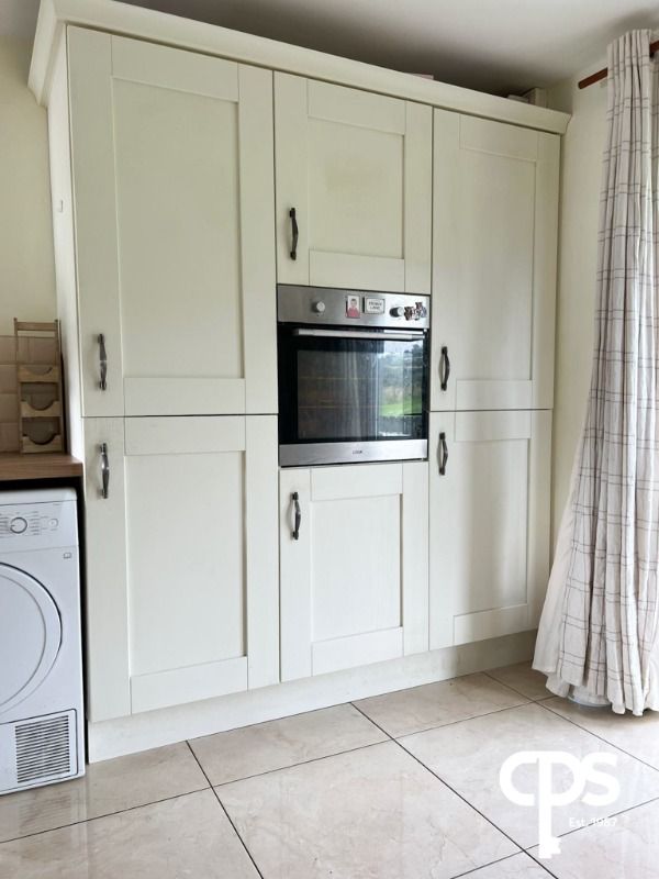 Kitchen/Dining (14'7 x 10'4) tiled floor, cream high and low level units, 4 ring electric hob with stainless steel extractor hood over, plumbed for automatic washing machine & tumbledryer, plumbed for dishwasher, integrated fridge & freezer, integrated Logic oven & grill, back door leading to patio area with artificial grass and covered seating area, fencing to rear and side, oil tank, shed, garden laid to lawn