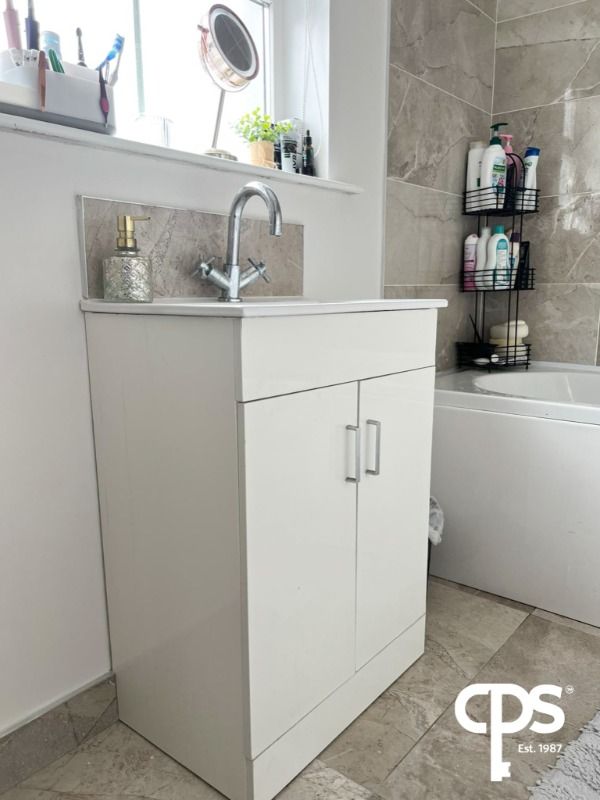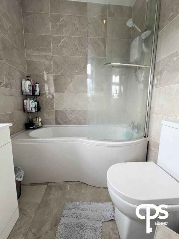 Family Bathroom with wc, wash hand basin with vanity unit under, vanity mirror, heated towel rail, Triton electric shower over bath, fully tiled walls, tiled floor