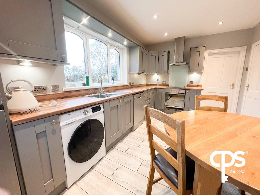 Kitchen/Dining - 3 m x 4.6 m, eye and low level kitchen units, 4 ring electric hob, electric oven under, extractor hood over, Beko dishwasher, plumbed for automatic washing machine, fridge & freezer, matching tiled floor, back door