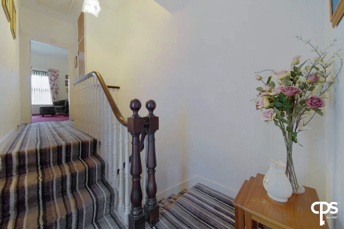 Stairs to attractive first floor landing with feature window allowing for plenty of natural light, carpet to stairs and landing