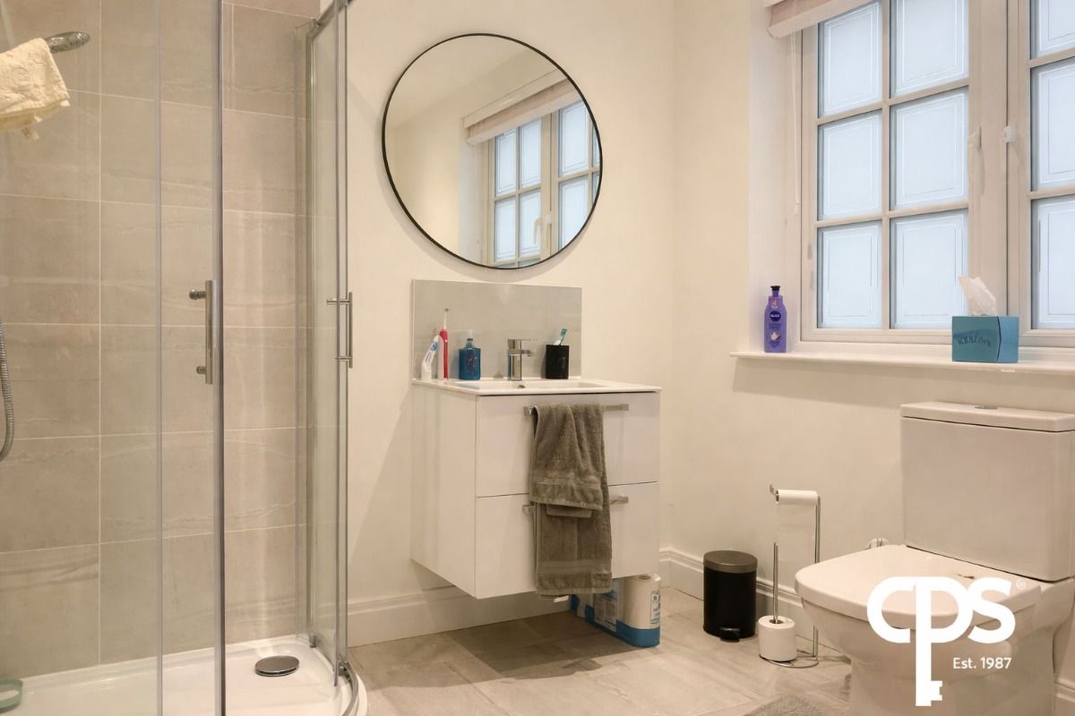 Family Bathroom - 2.7 m x 2.1 m, wc, wash hand basin, vanity mirror over, vanity unit under, high quality ceramic filed floor, separate bath, partially tiled wall, fully tiled step in walk in shower