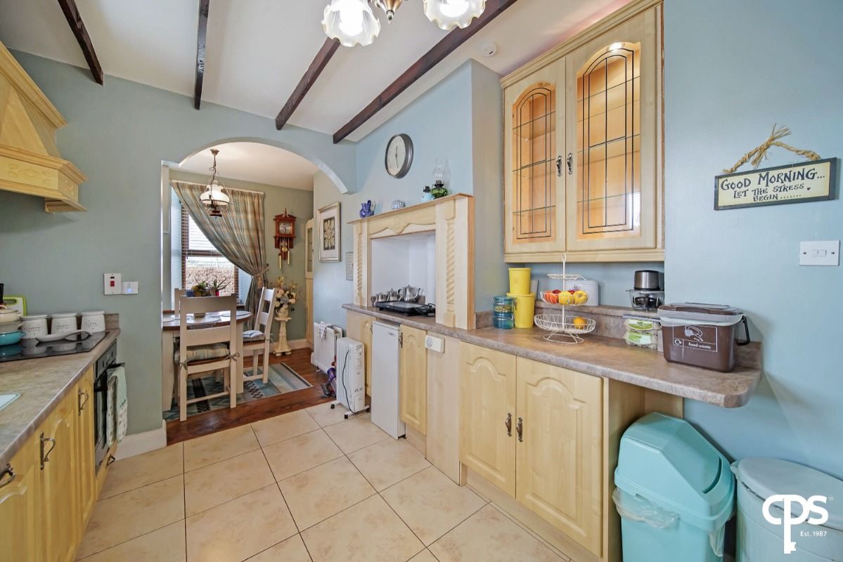 Kitchen (6.6m x 2.6m (including Dining Area)) - attractive rural views, matching tiled floor, range of high quality high and low level kitchen units, countertops, tiled walls between units, integrated fridge freezer, integrated dishwasher, inglenook with canopy over, exposed ceiling beams, archway to