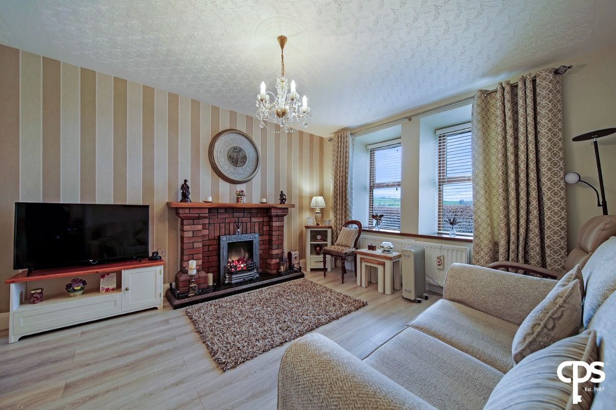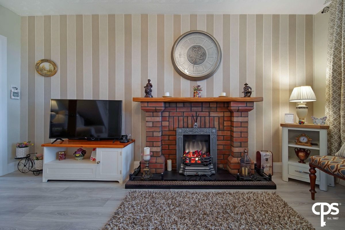 - The cosy living room is rich in character, featuring a red brick fireplace, wooden overmantle and serene countryside vistas — perfect for relaxed evenings.