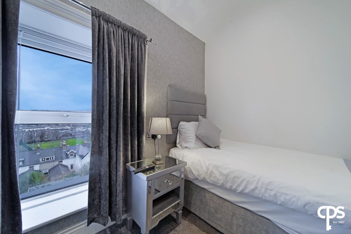Bedroom B - 3.3m x 2.4m - keyless entry, carpet to floor, fully furnished with single bed, bedside locker, dressing table, tv, heated towel rail, lovely views over the City Centre