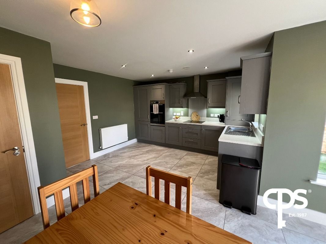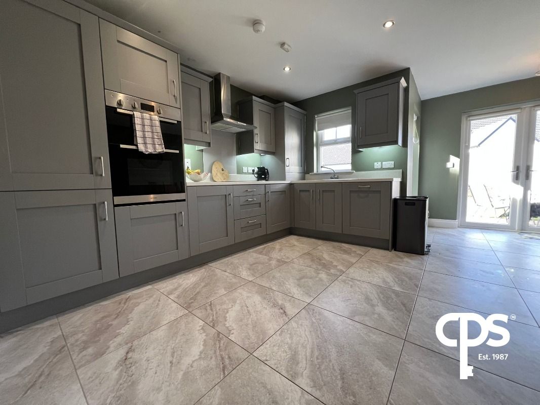 Kitchen/Dining 4.9m x 5.4m - tiled floor, downlighters, range of attractive high and low level units, integrated fridge freezer, integrated dishwasher, integrated oven, 4 ring electric hob with stainless steel extractor hood over, patio doors