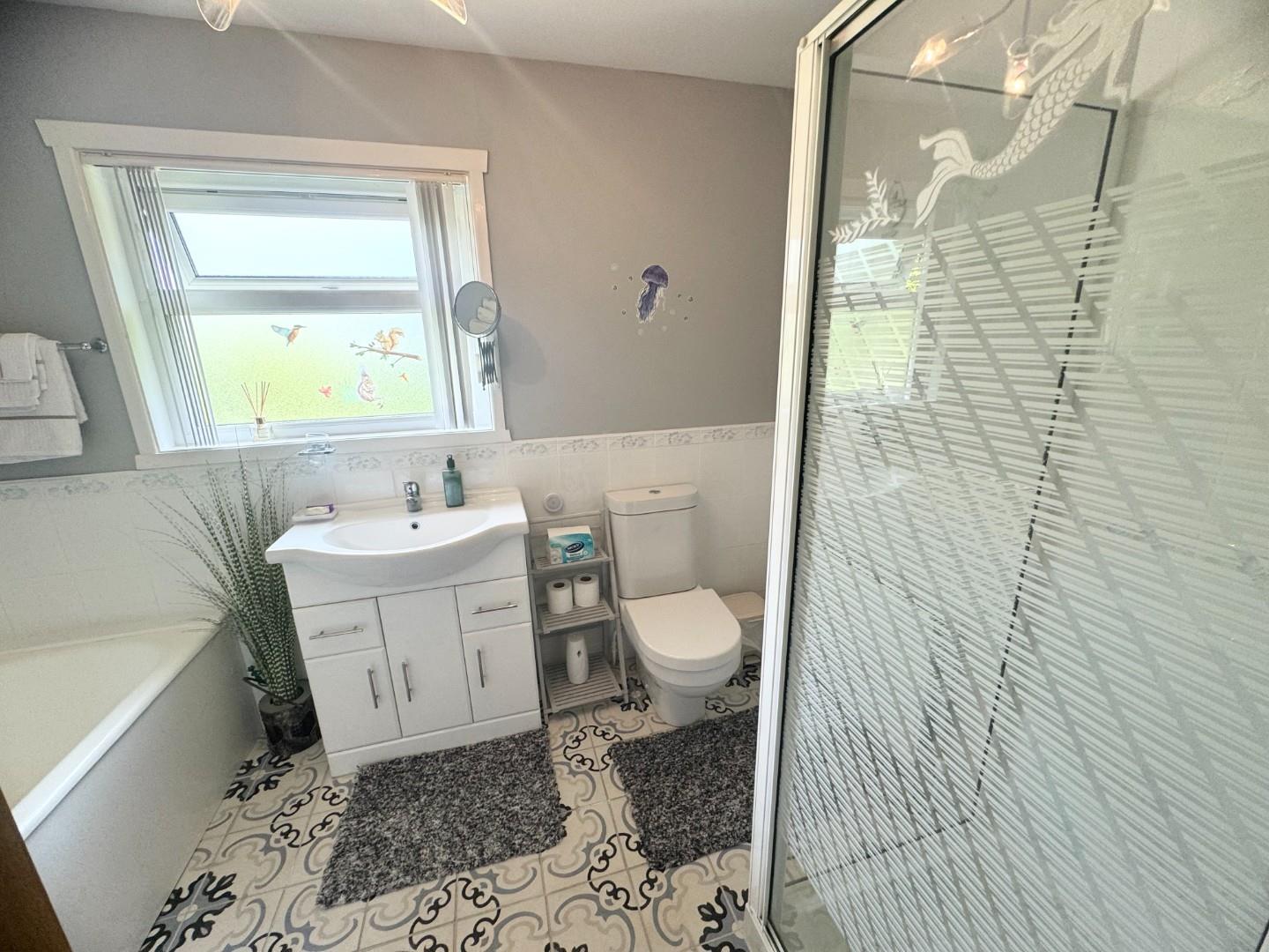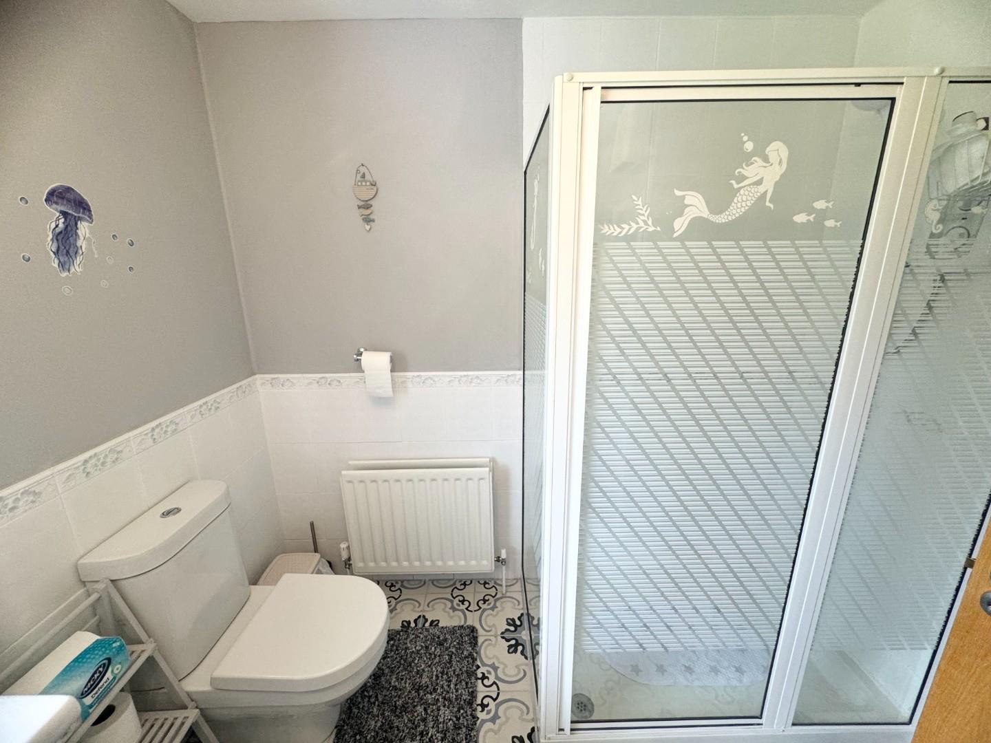 White suite comprising enamel panel bath, LFWC, wash hand basin and storage, corner shower with glass doors and electric shower, extractor, tiled floor and part tiled wall.