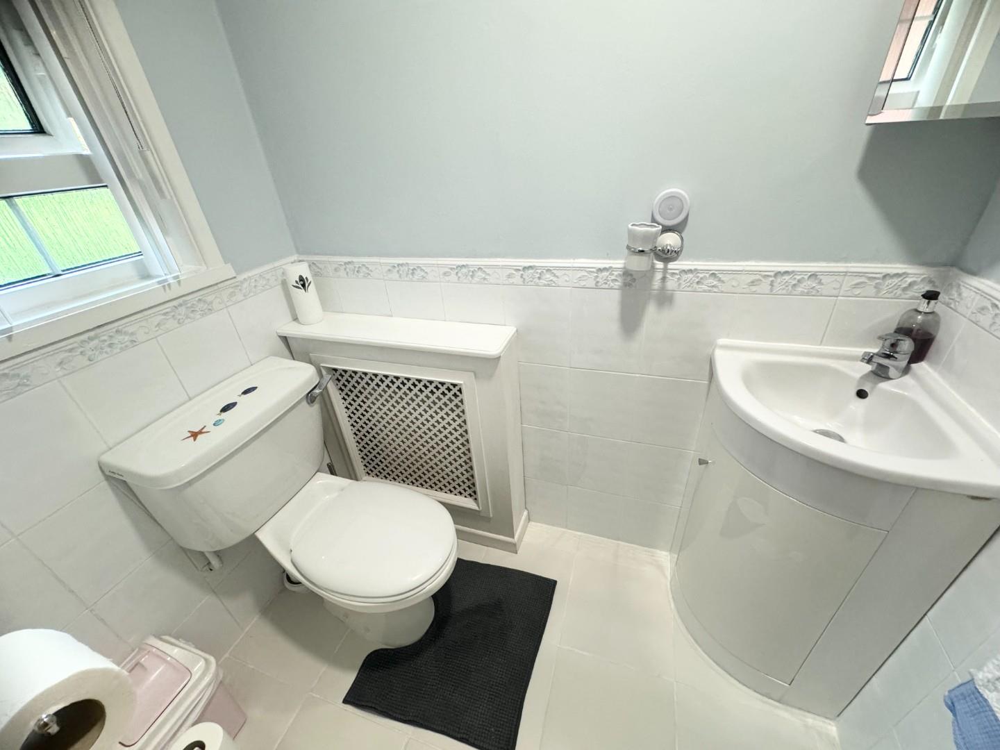 There is an extra toilet in hallway for guests with LFWC and wash hand basin, tiled floor and part tiled wall.