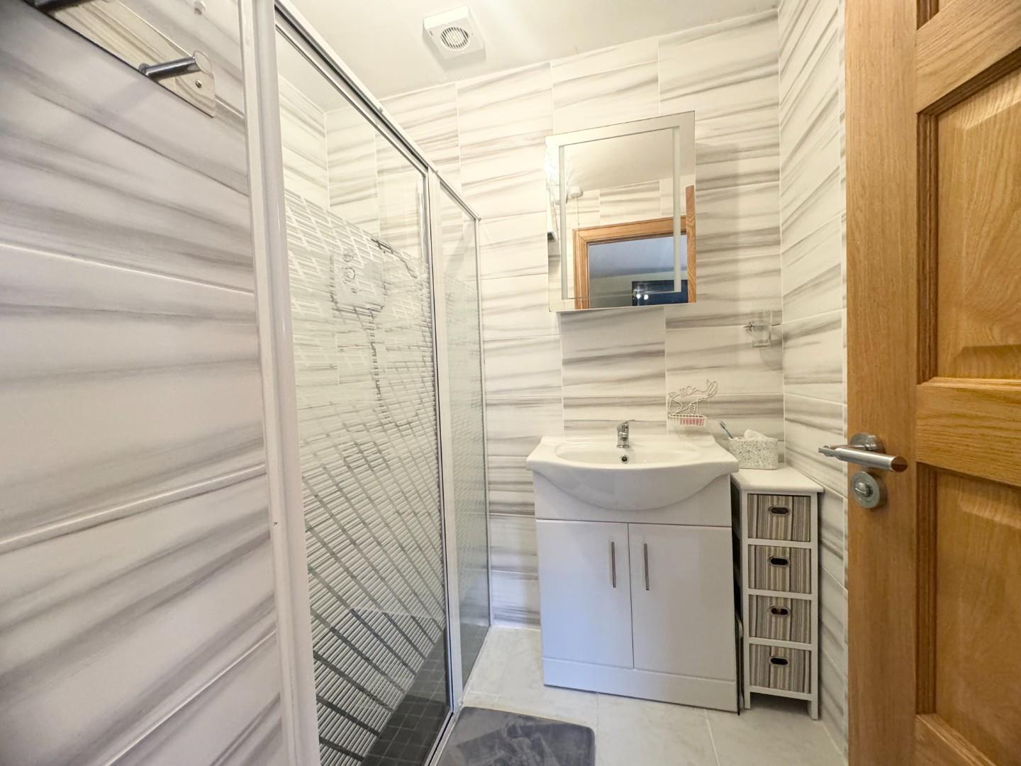 White suite with fully tiled wall and floor with wash hand basin and storage below and double shower unit with electric shower and glass doors.