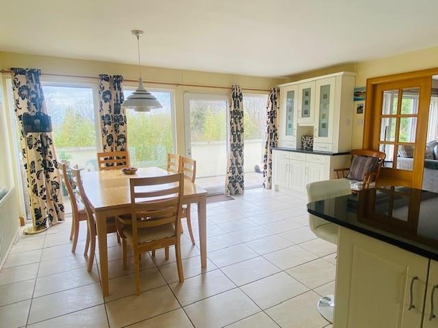 This bright spacious room has solid oak flooring and has a solid fuel stove set in a recess with tiled hearth and has a back boiler to heat the radiators and water, PVC door to large paved patio overlooking the garden.