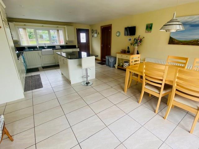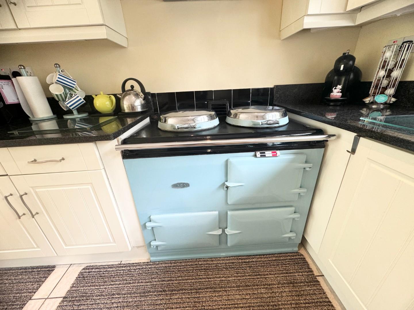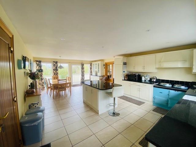 This large space has a modern cream kitchen with granite work top, which includes high and low level units, integrated dish washer and fridge, Belfast sink with mixer taps , aga cooker that heats the water and has an extractor above, large dining space with a door opening to the patio, tiled floor part tiled wall and recessed lights, there is a large granite top island for casual dining and storage.