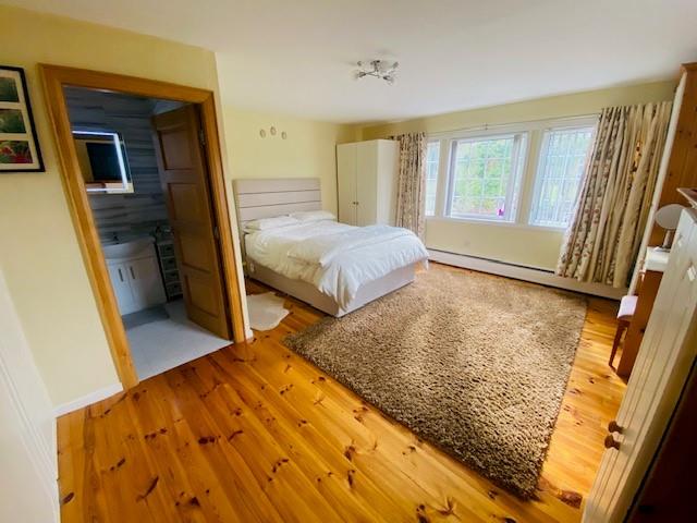 Solid wood door to hallway with maple wood flooring and 2 storage cupboards.
