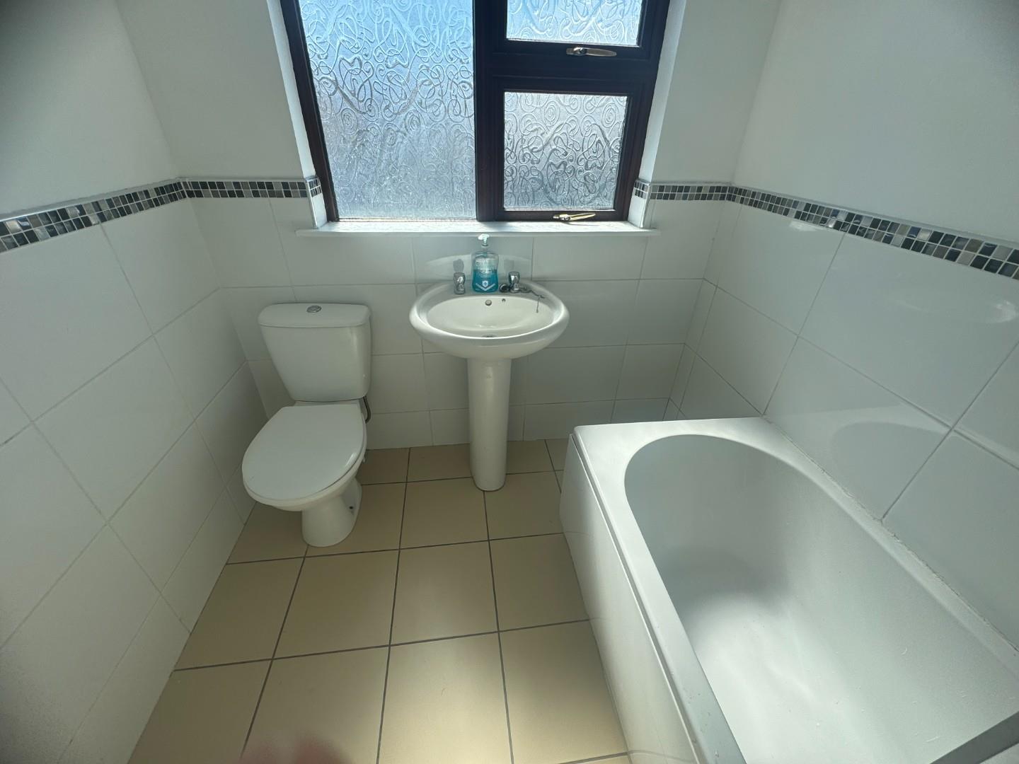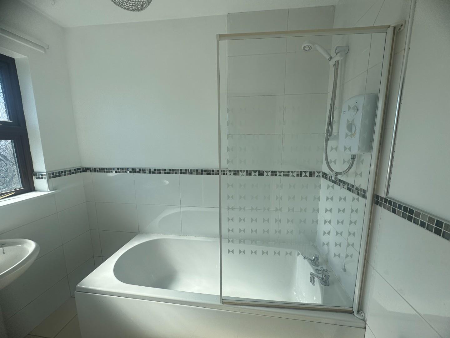 White suite comprising LFWC, pedestal wash hand basin, panel bath and new electric shower above it, with glass shower screen, tiled floor and part tiled wall.