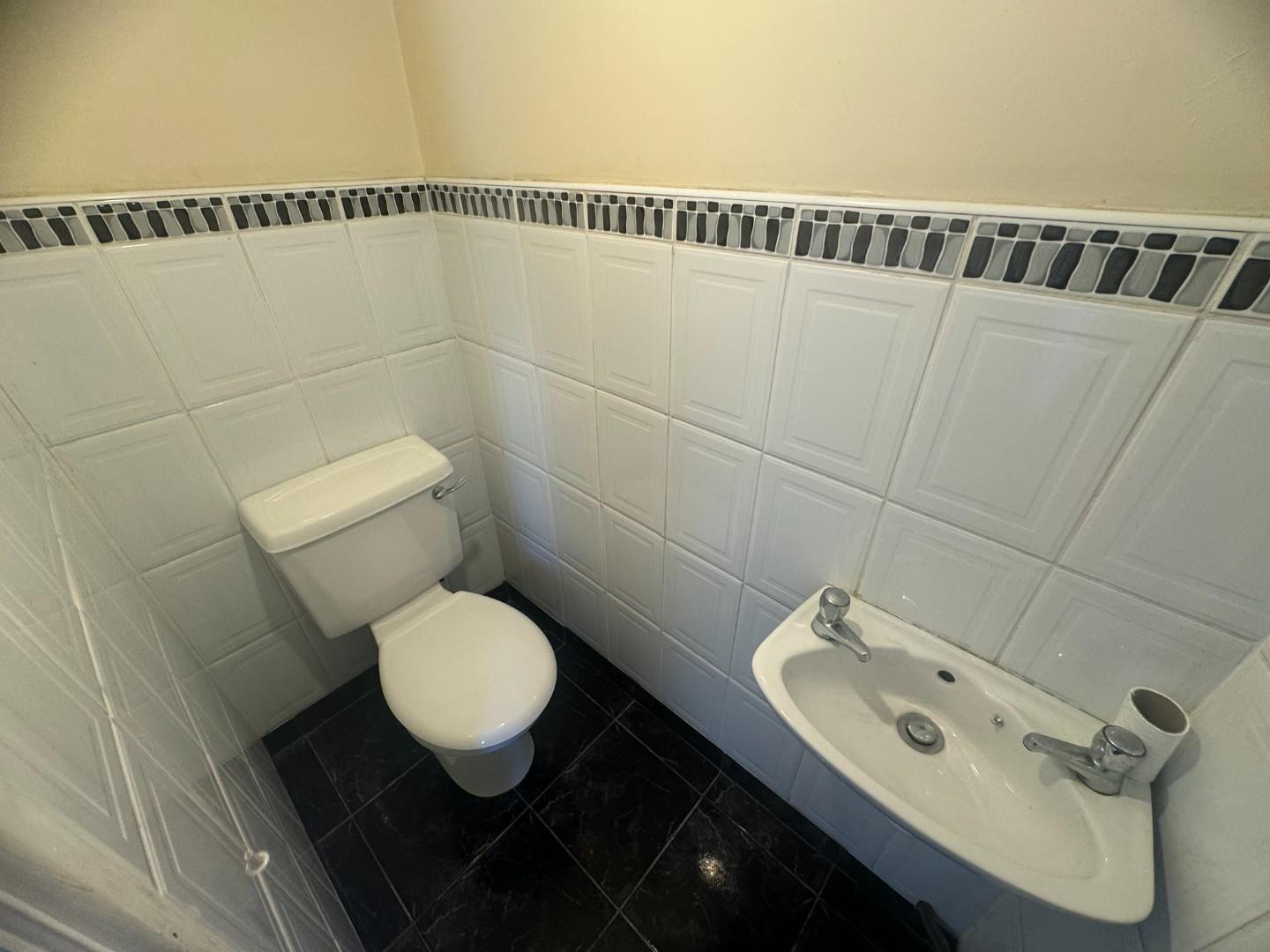 New toilet with LFWC and wash hand basin, tiled floor and part tiled wall.