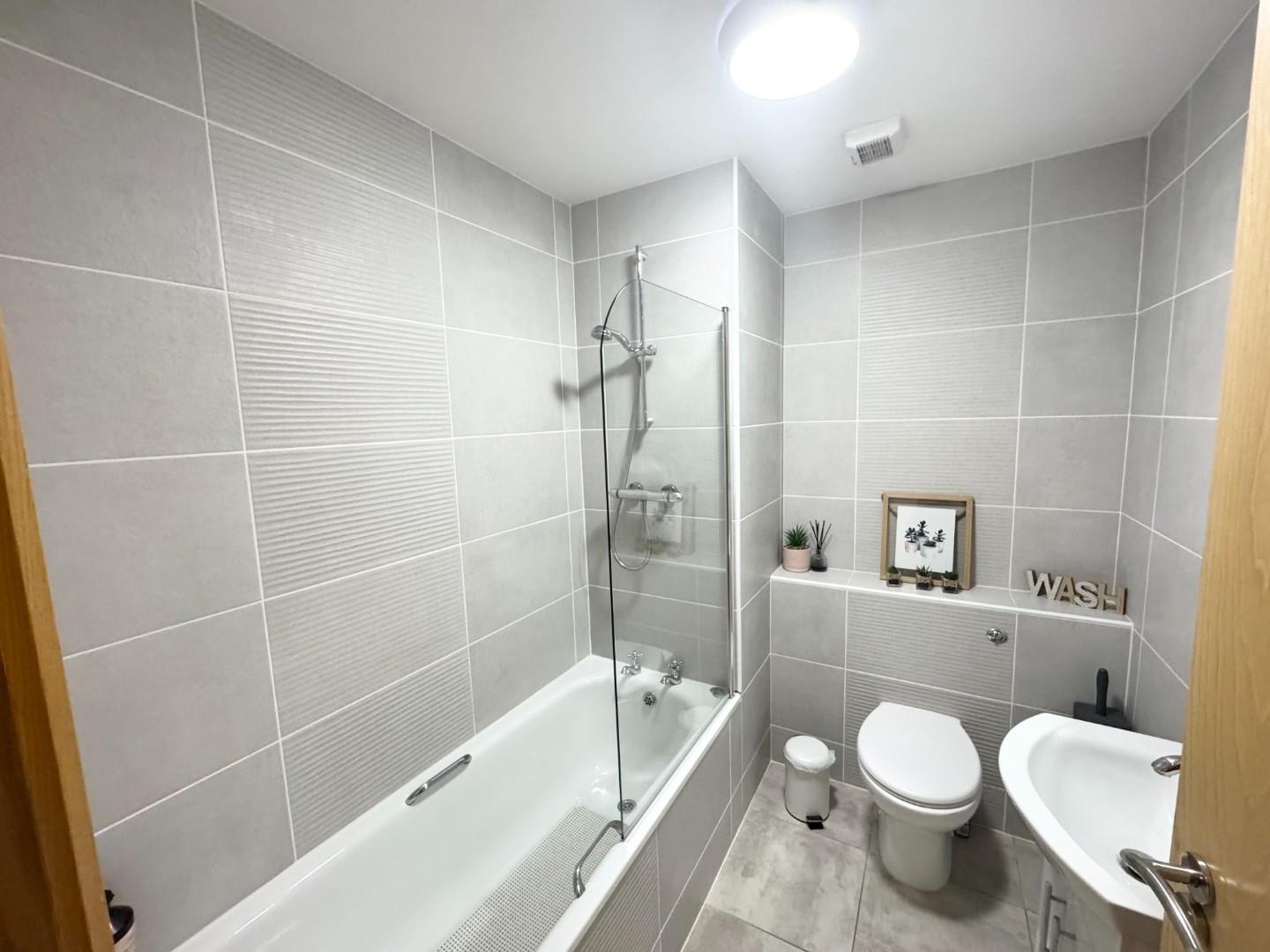 New bathroom fully tiled wall and floor, white suite with LFWC, wall mounted wash hand basin and panel with shower attached above and glass screen door, extractor and radiator.
