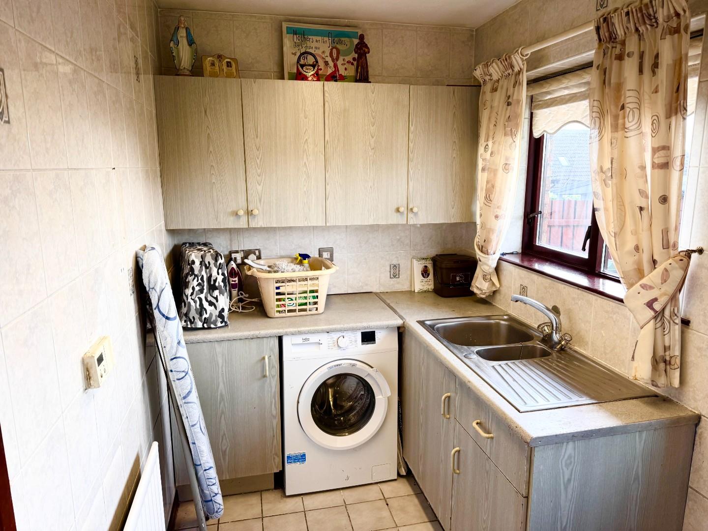 High and low level units, 11/2 stainless steel and drainer, tiled floor, part tiled wall, plumbed for washing machine, door to garden, door to garage.