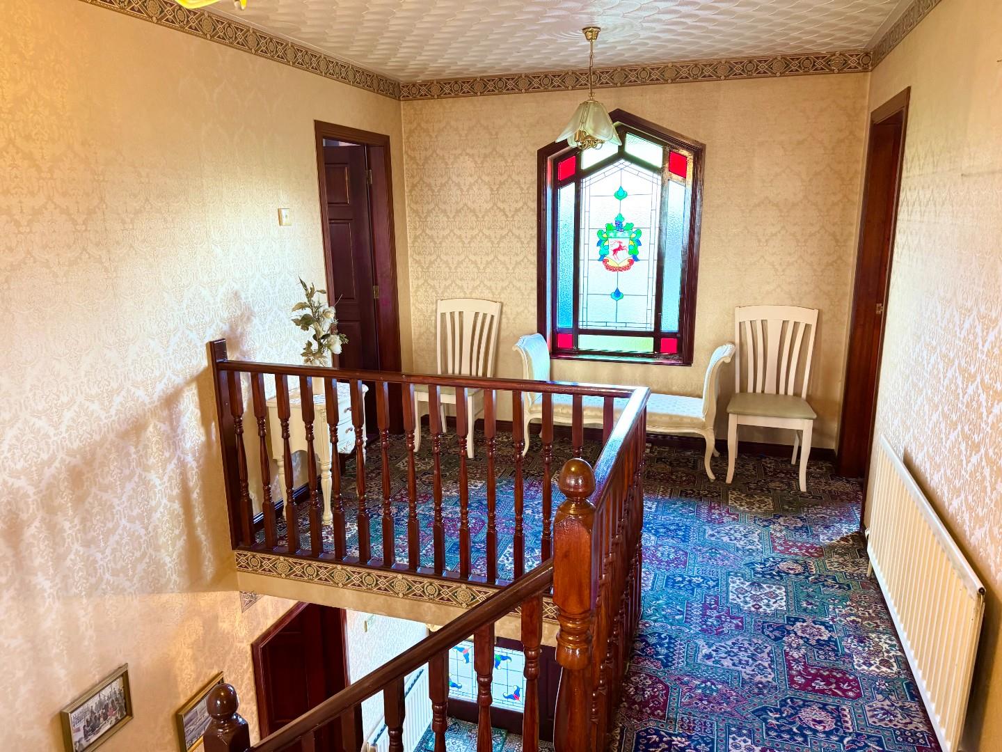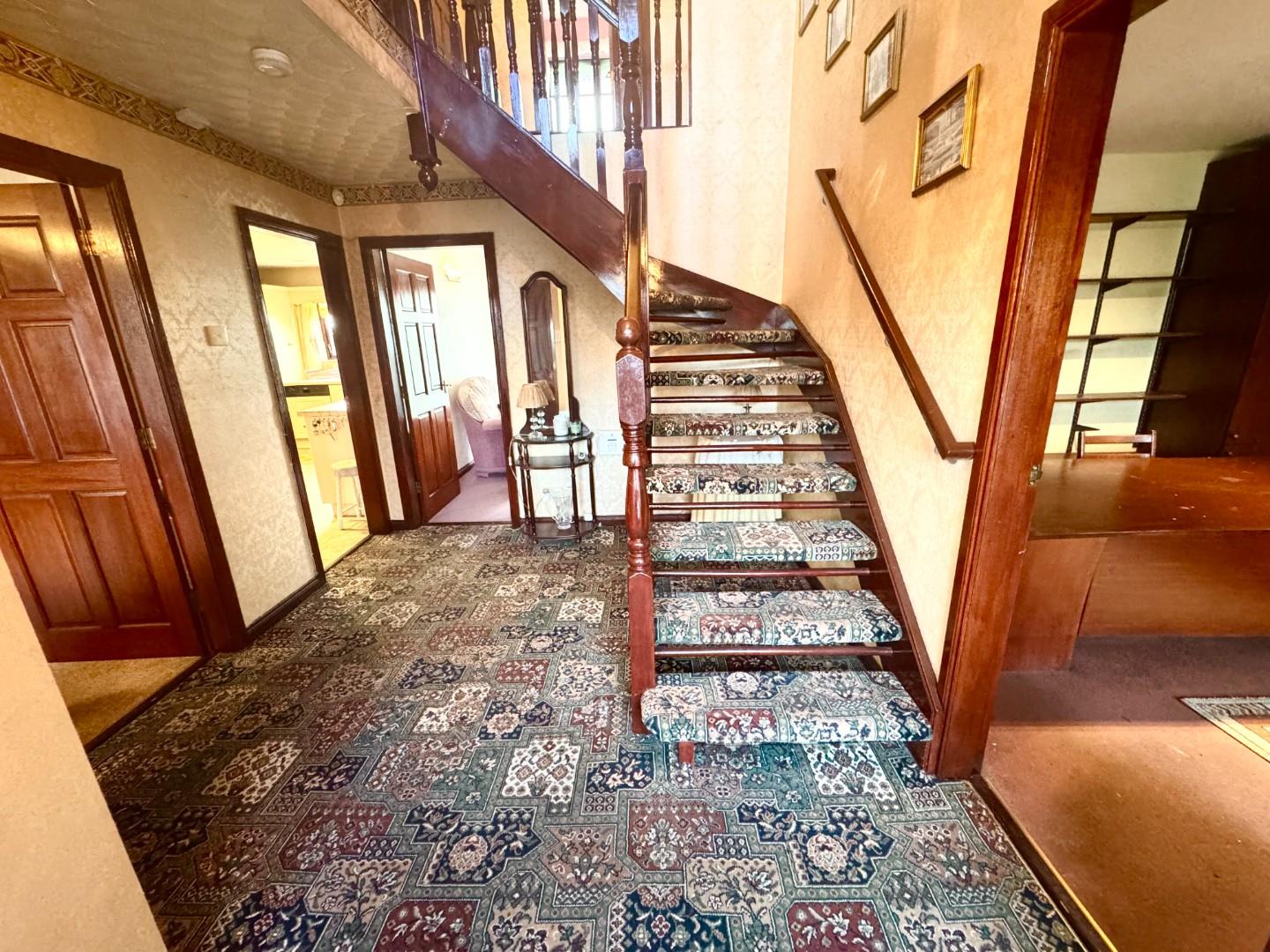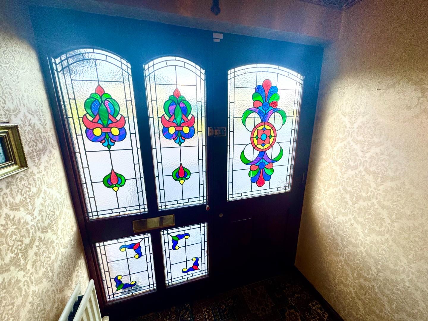 Wooden front door with lead stained glass to spacious hallway with carpet floor.