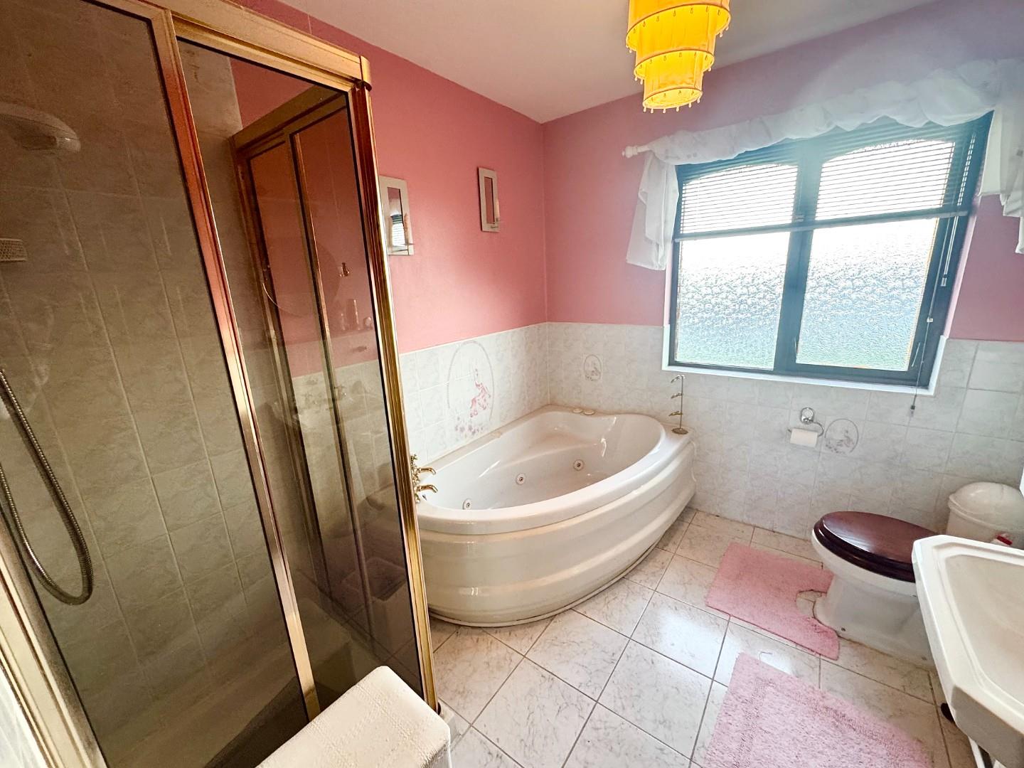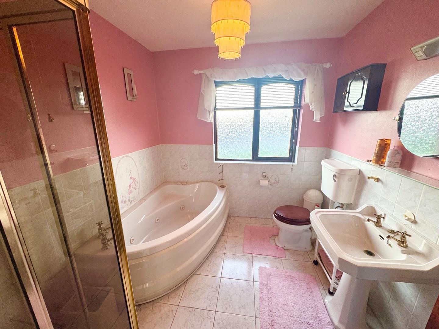 White suite consisting of LFWC, pedestal wash hand basin, panel corner jacuzzi bath, separate shower cabinet with glass door and fully tiled walls. Tiled floor and part tiled wall.