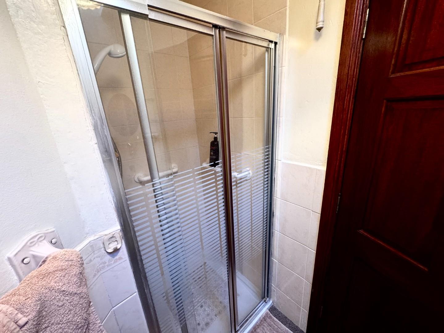 White suite with LFWC, pedestal wash hand basin, shower unit fully tiled with glass door and electric shower.