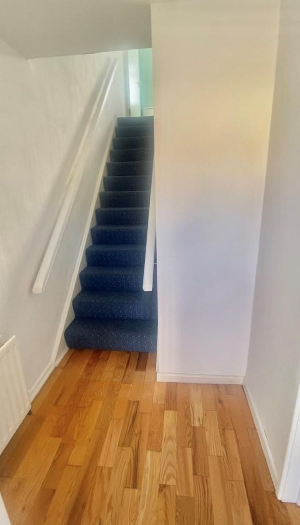 PVC front door to solid wood floor hallway leading to stairs.