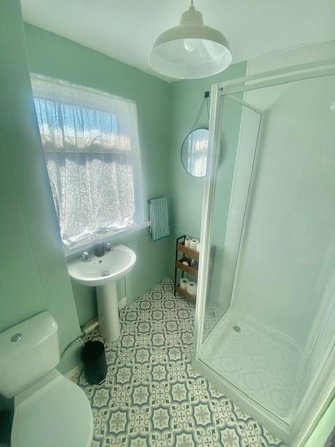 White suite with LFWC, pedestal wash hand basin and corner glass shower unit with electric shower, fully tiled walls and Linoleum flooring