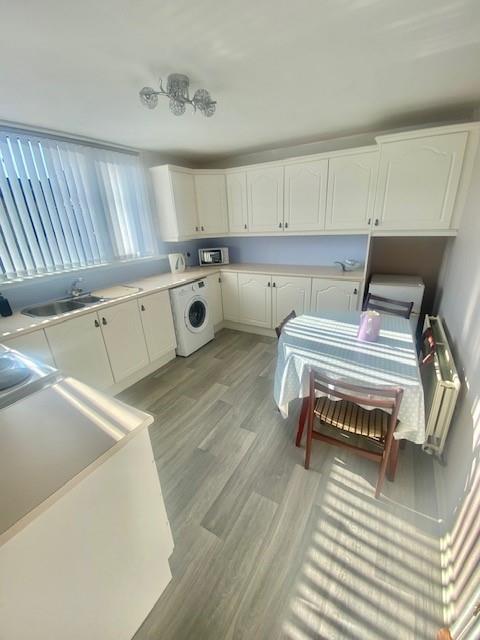 Bright good sized area with modern high and low level units, with 11/2 stainless steel sink and drainer, wired for electric cooker with extractor above, plumbed for washing machine and space for fridge freezer. Part tiled wall and linoleum flooring.
