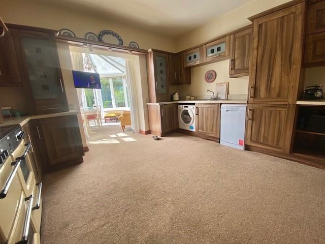 Modern kitchen with high and low level units, 11/2 stainless steel sink and drainer, integrated fridge freezer, plumbed for dishwasher and washing machine. Wire for electric cooker with extractor above, carpet flooring.