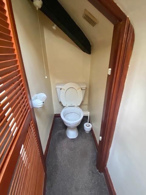 This is an attic room with dormir window and wash hand basin, carpet floor & toilet