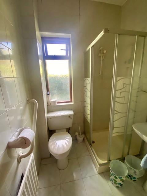 Coloured suite with LFWC, pedestal wash hand basin and corner shower with electric unit and glass doors, fully tiled walls and floor.