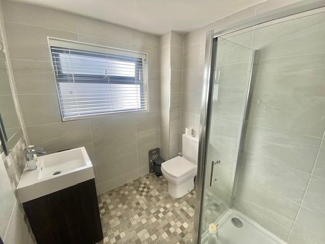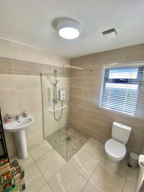 New fully tilled wall and floor wet room, with LFWC, pedestal wash hand basin and walk in shower with glass screen, electric shower and towel rad. extractor.