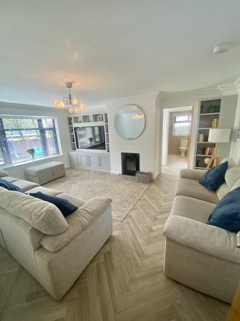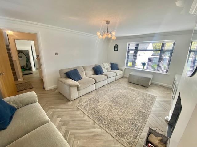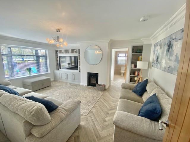 Superb living room with bay window for natural light, solid fuel stove , tiled floor and cornicing. Media wall.