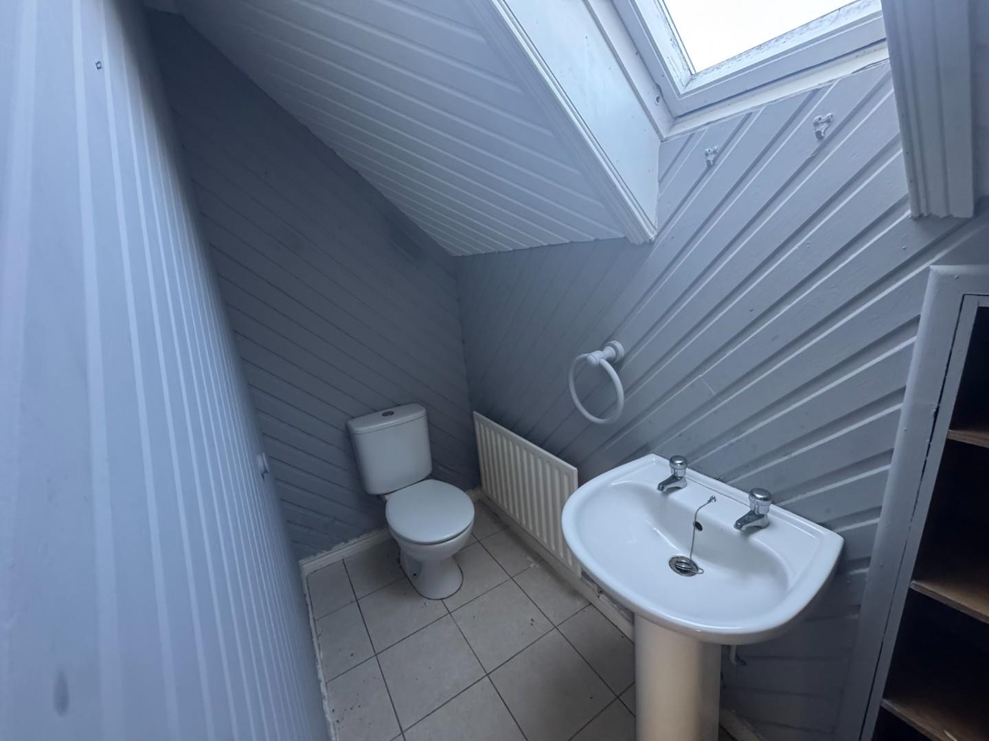 LFWC and wash hand basin, with T&G wooden walls and laminate flooring. and velux window.