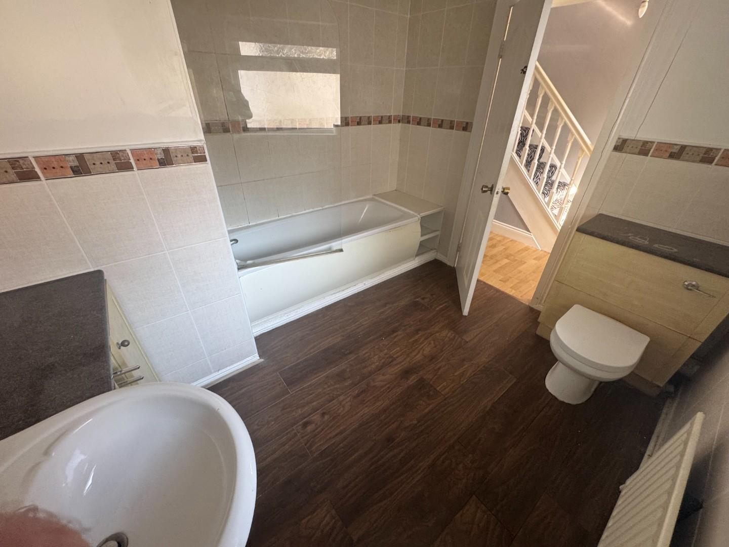 White suite with LFWC, wash hand basin and storage with mirror above, panel bath with electric shower above and glass shower screen. Laminate floor and part tiled wall.