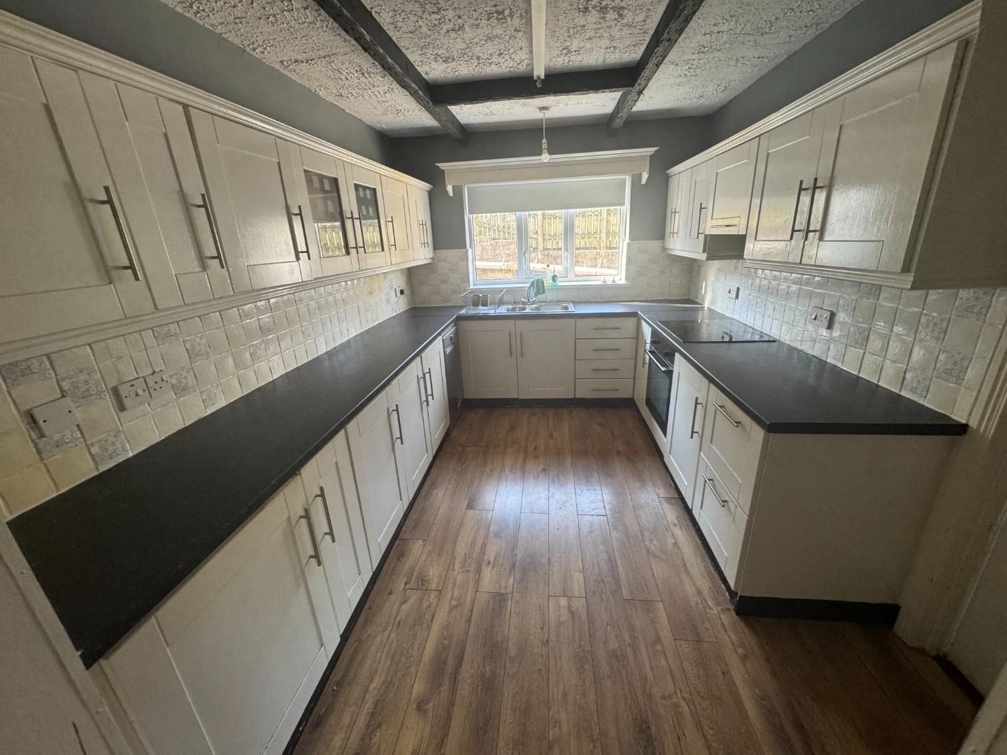 Modern kitchen with high and low level units, 11/2 stainless steel sink and drainer, integrated electric hob and oven with extractor above, built in dish washer, laminate floor and part tiled wall. Feature beams on ceiling.