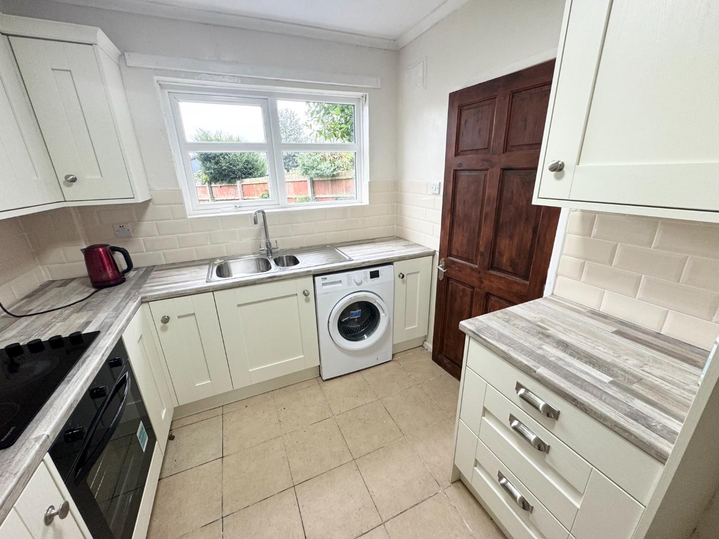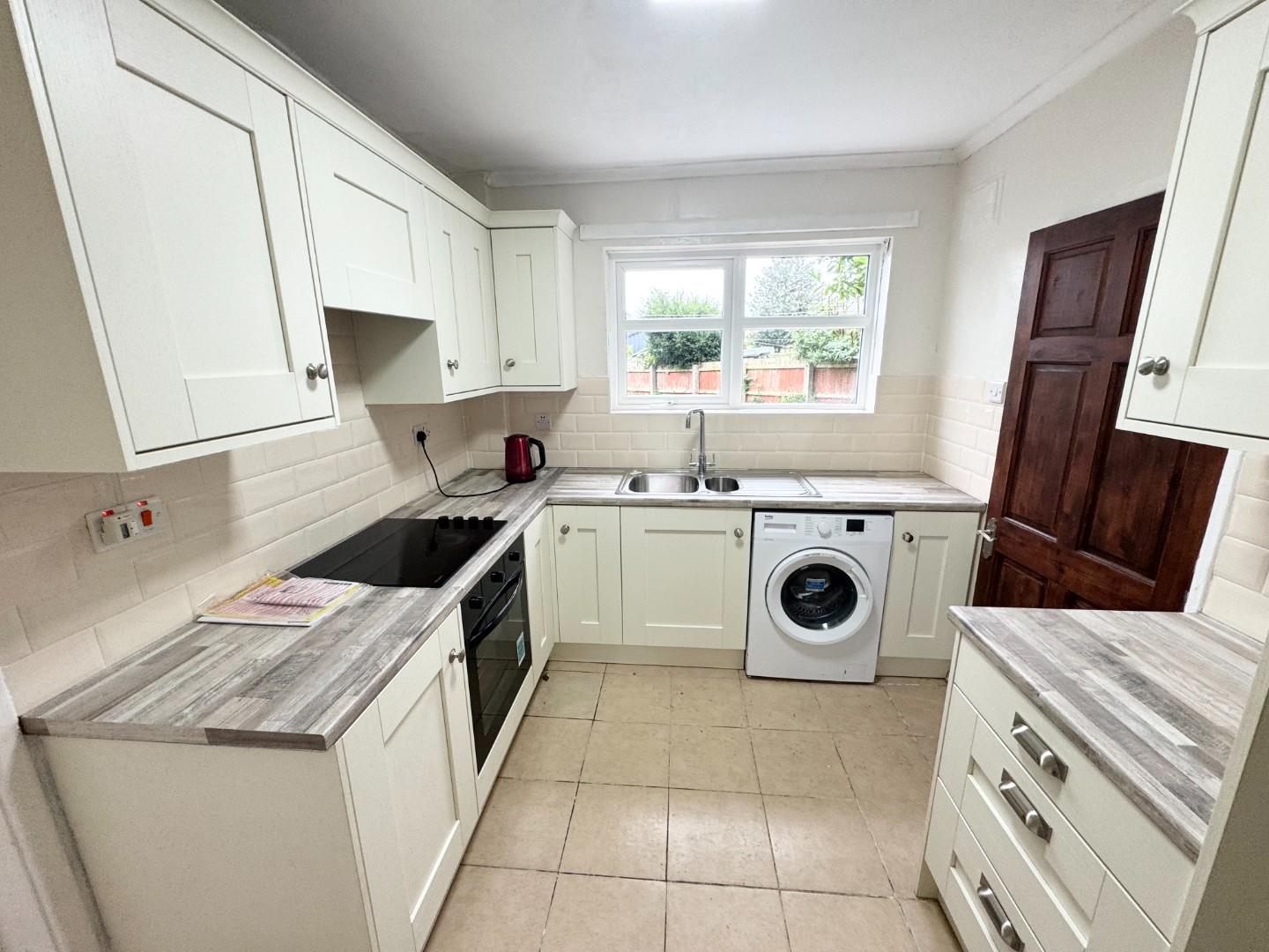 New kitchen with high and low level units, integrated electric hob and oven with extractor above, washing machine fitted, space for fridge freezer. tiled floor part tiled wall.