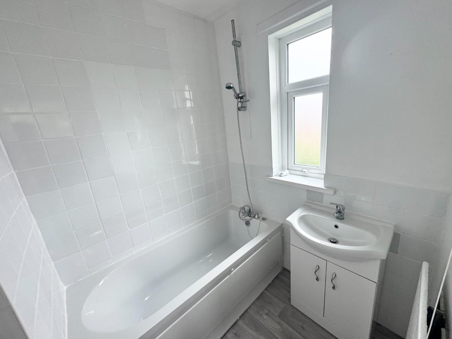 New white suite with panel bath and shower attachment above , wash hand basin with storage below, new linoleum flooring. Part tiled wall.