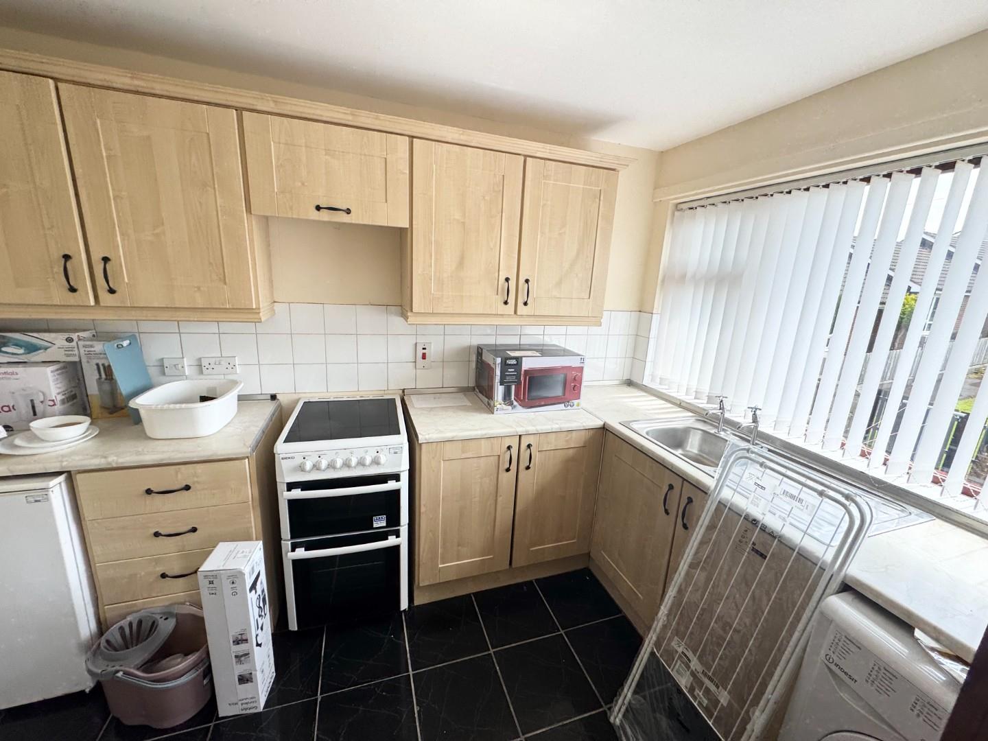 Bright kitchen with high and low level units, tiled floor part tiled wall, stainless steel sink and drainer, electric cooker, plumbed for washing machine,