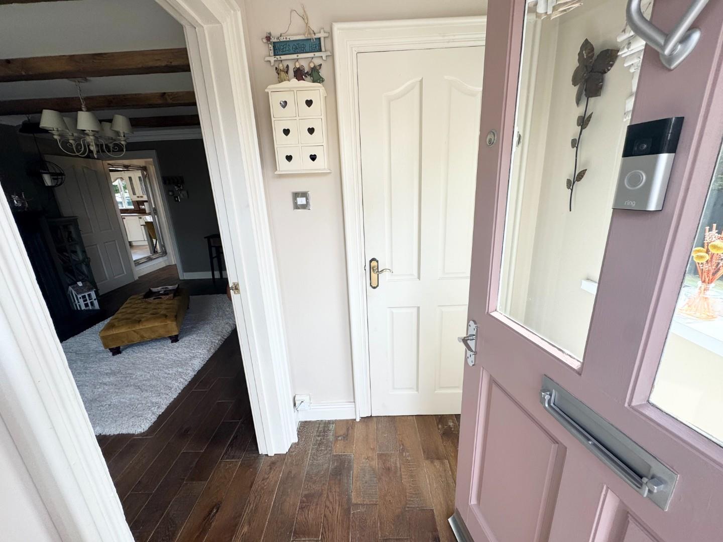 Wooden front door to small hallway with wooden floor and storage.