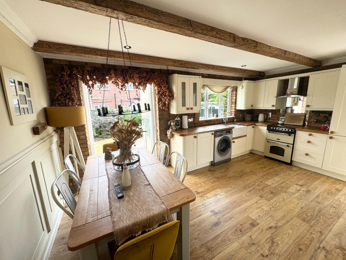 an washing machine. Fully laminated flooring and cladding red brick effect kitchen walls, wooden paneling on dinning wall,