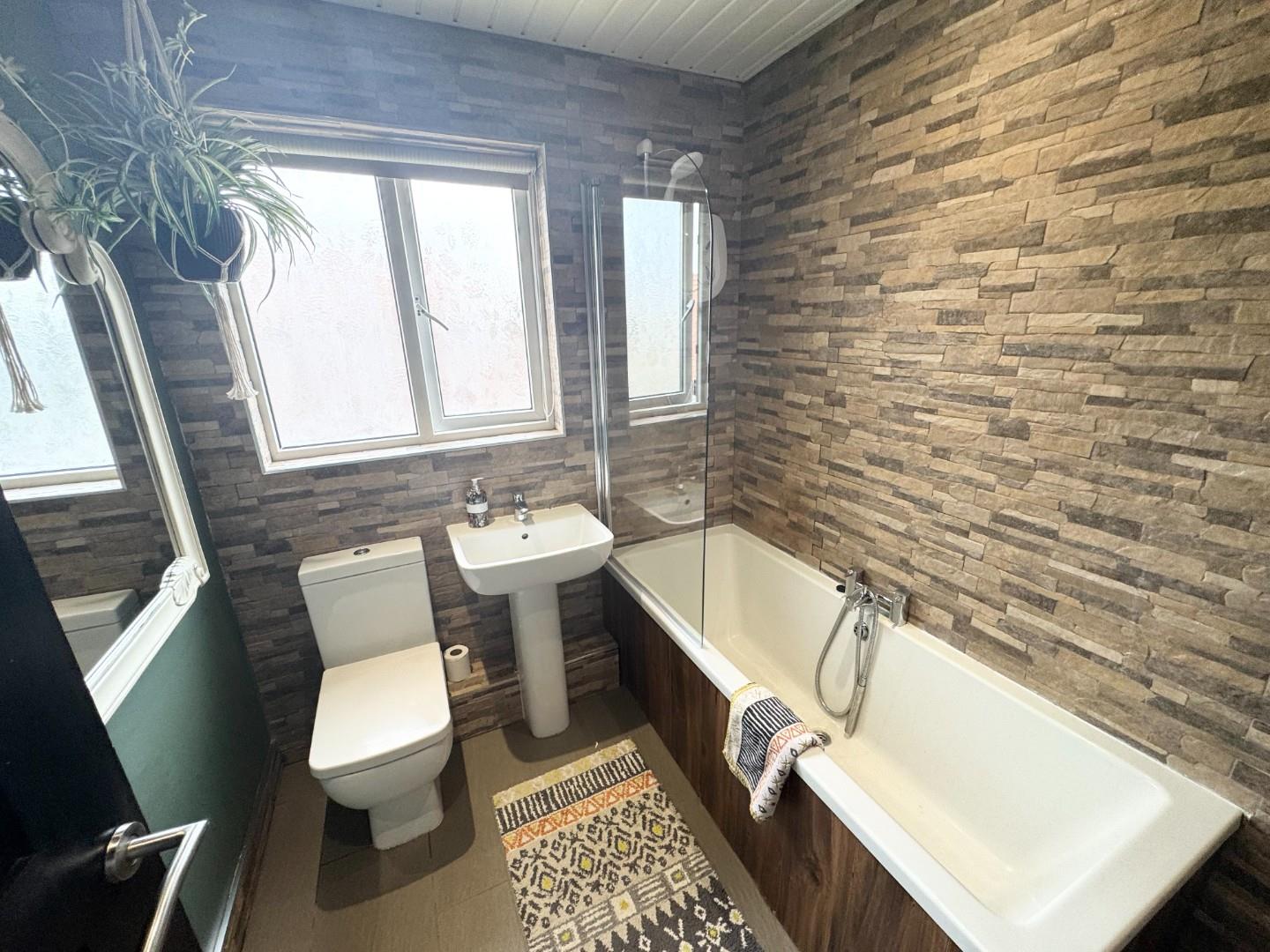 Panel bath, with electric shower above and glass shower screen, towel radiator which is chrome, T&G PVC celling, extractor and recessed lights.