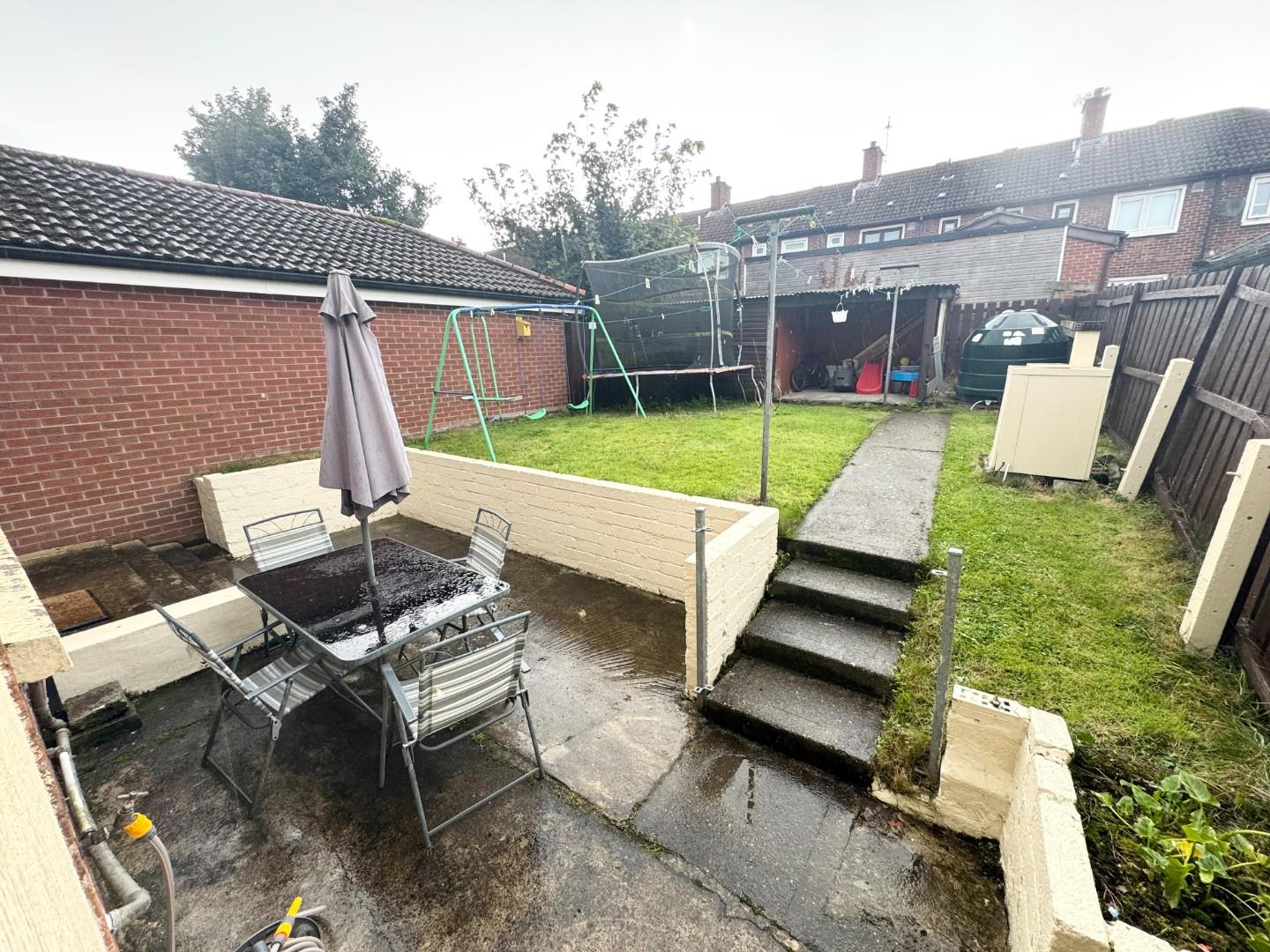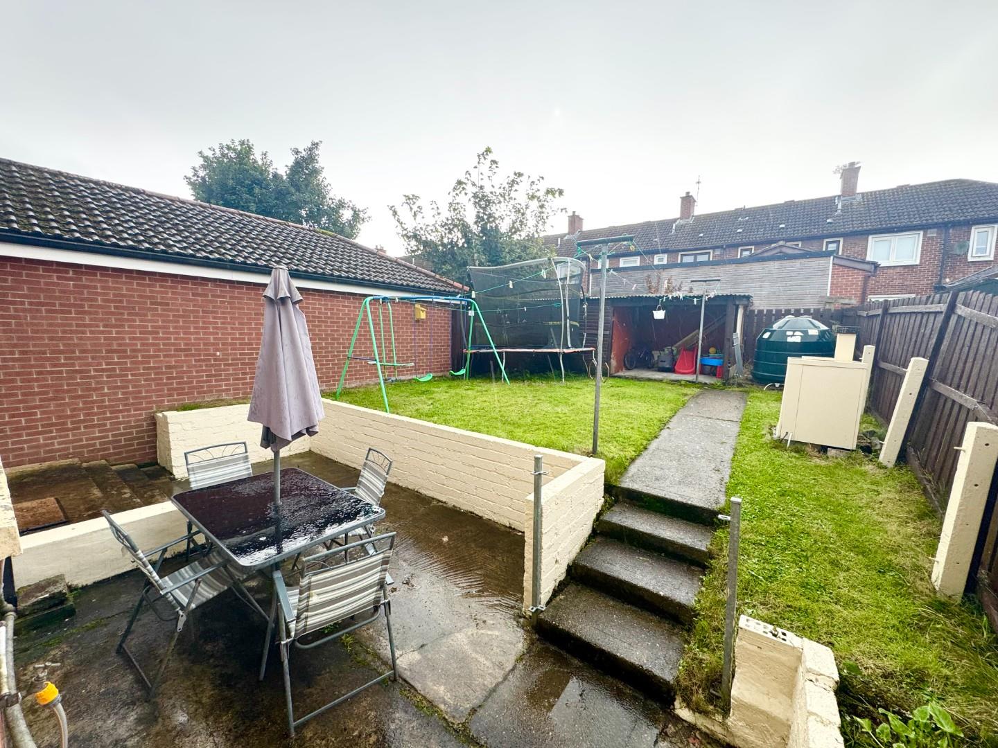 REAR: has a concrete patio large enough for table and chairs and garden in lawn, with storage shed for toys etc, fully enclosed and South facing.