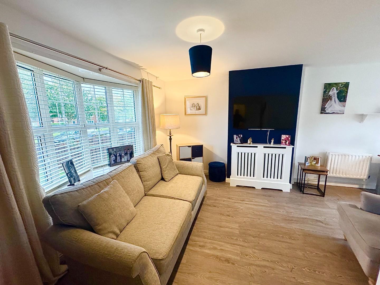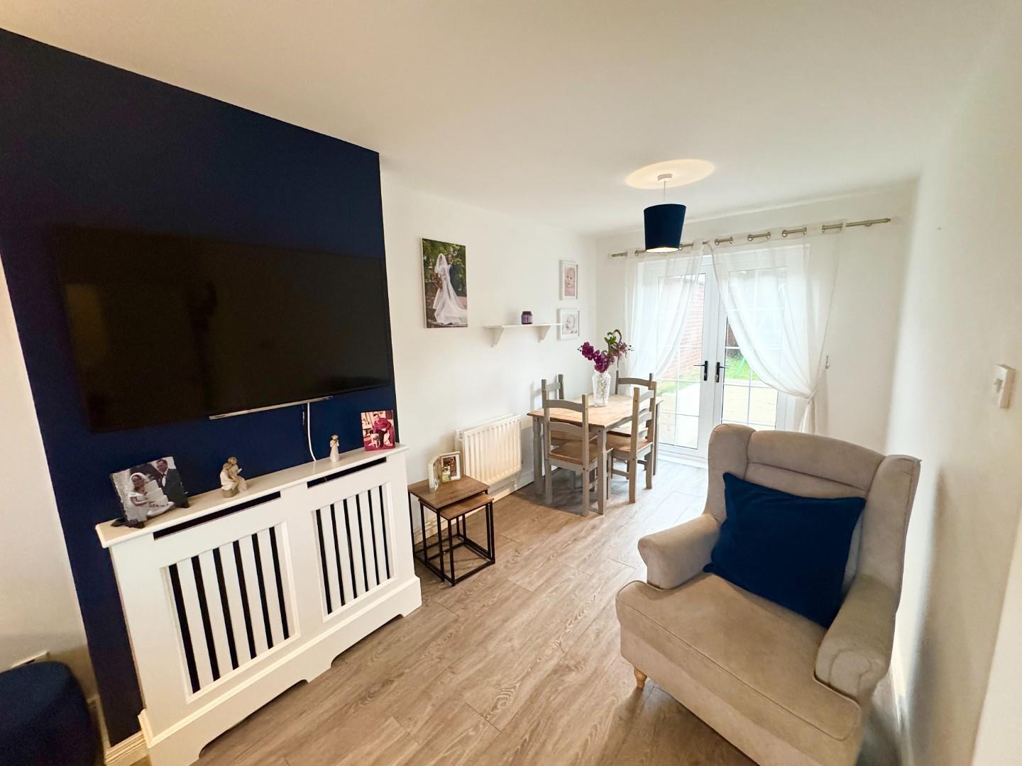 This L-shaped room is bright and spacious with new laminate flooring and double doors to patio and garden at the rear.