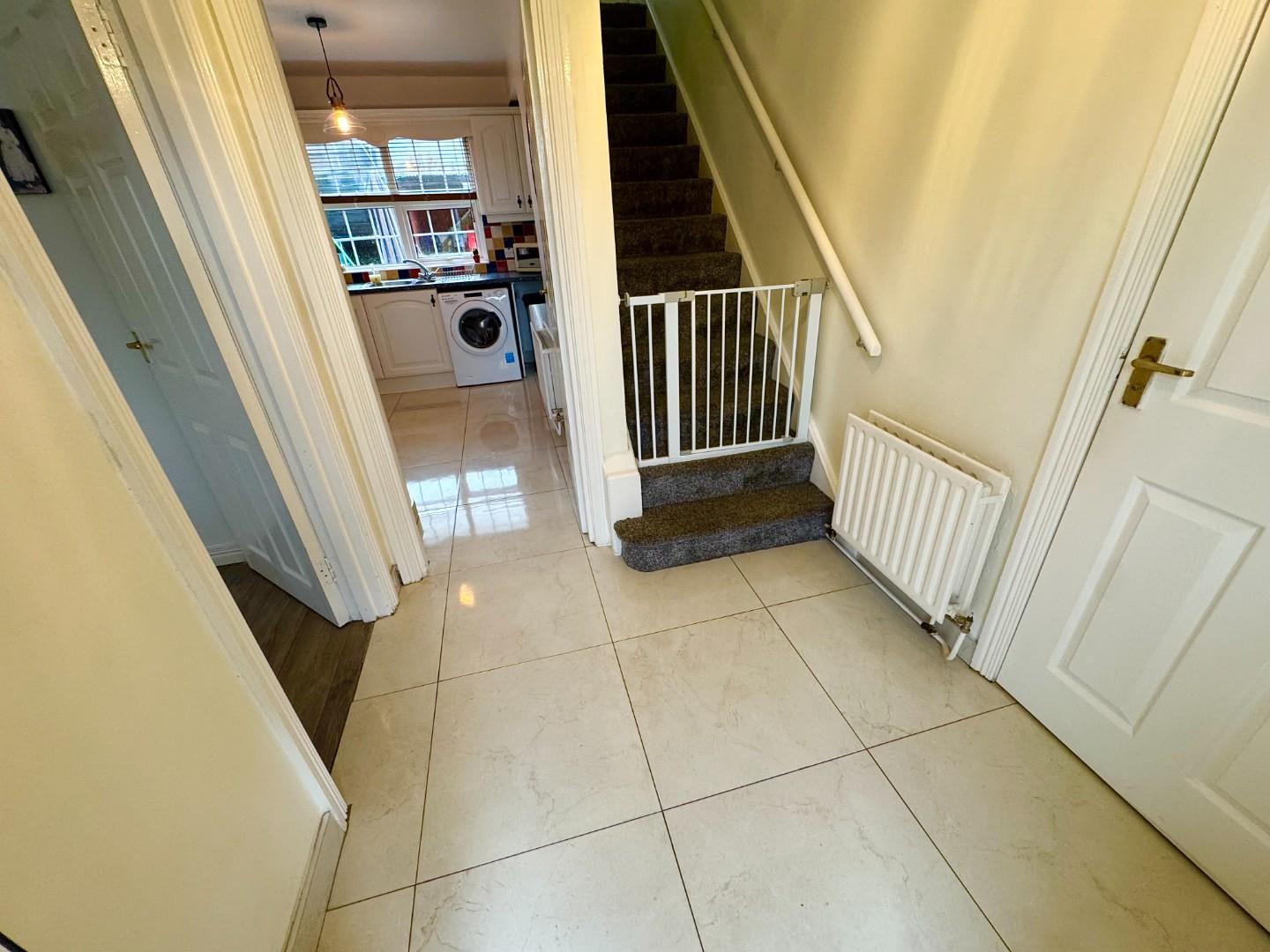 The rear porch has door to rear garden and patio and has also storage area under the stairs and in hall space.