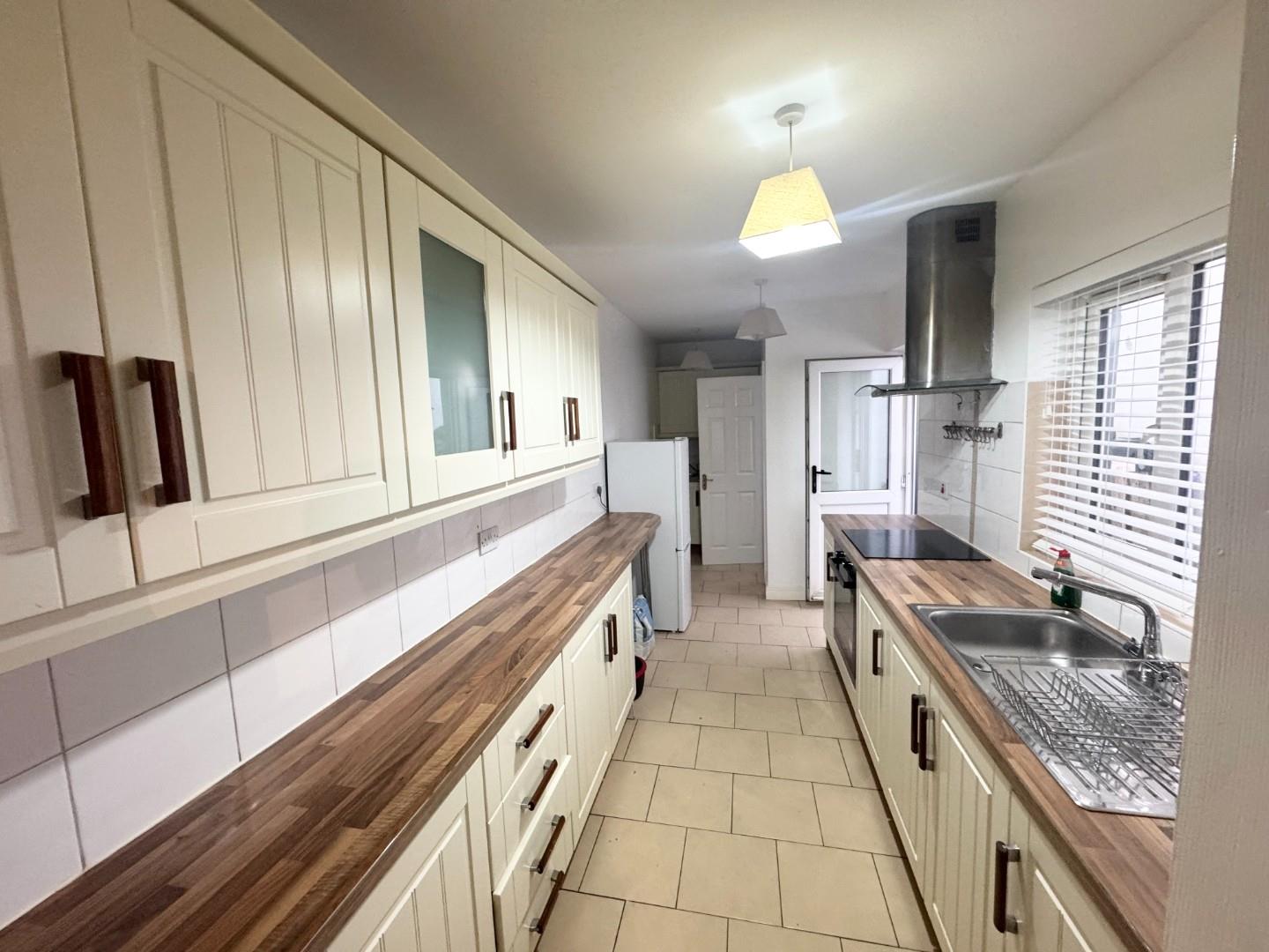 This new galley kitchen has high and low level units, stainless steel sink and drainer, integrated electric hob and oven with stainless steel extractor above. Tiled floor and part tiled wall. At the rear of the kitchen is another stainless steel sink and drainer, plumbed for washing machine and dryer and low level units.