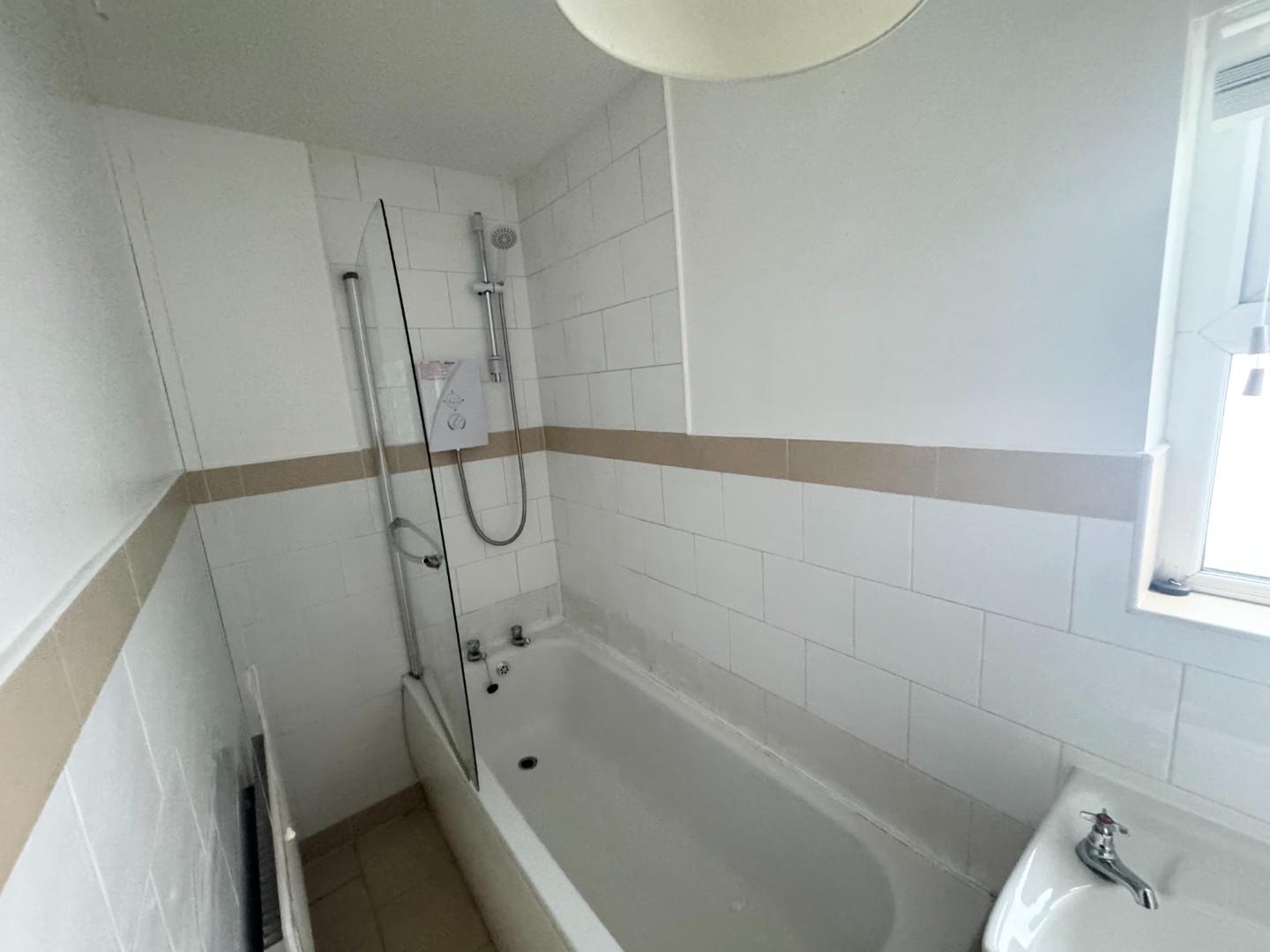 White suite comprising LFWC, pedestal wash hand basin, panel bath and electric shower above, glass shower screen, tiled floor and part tiled wall, extractor and radiator.