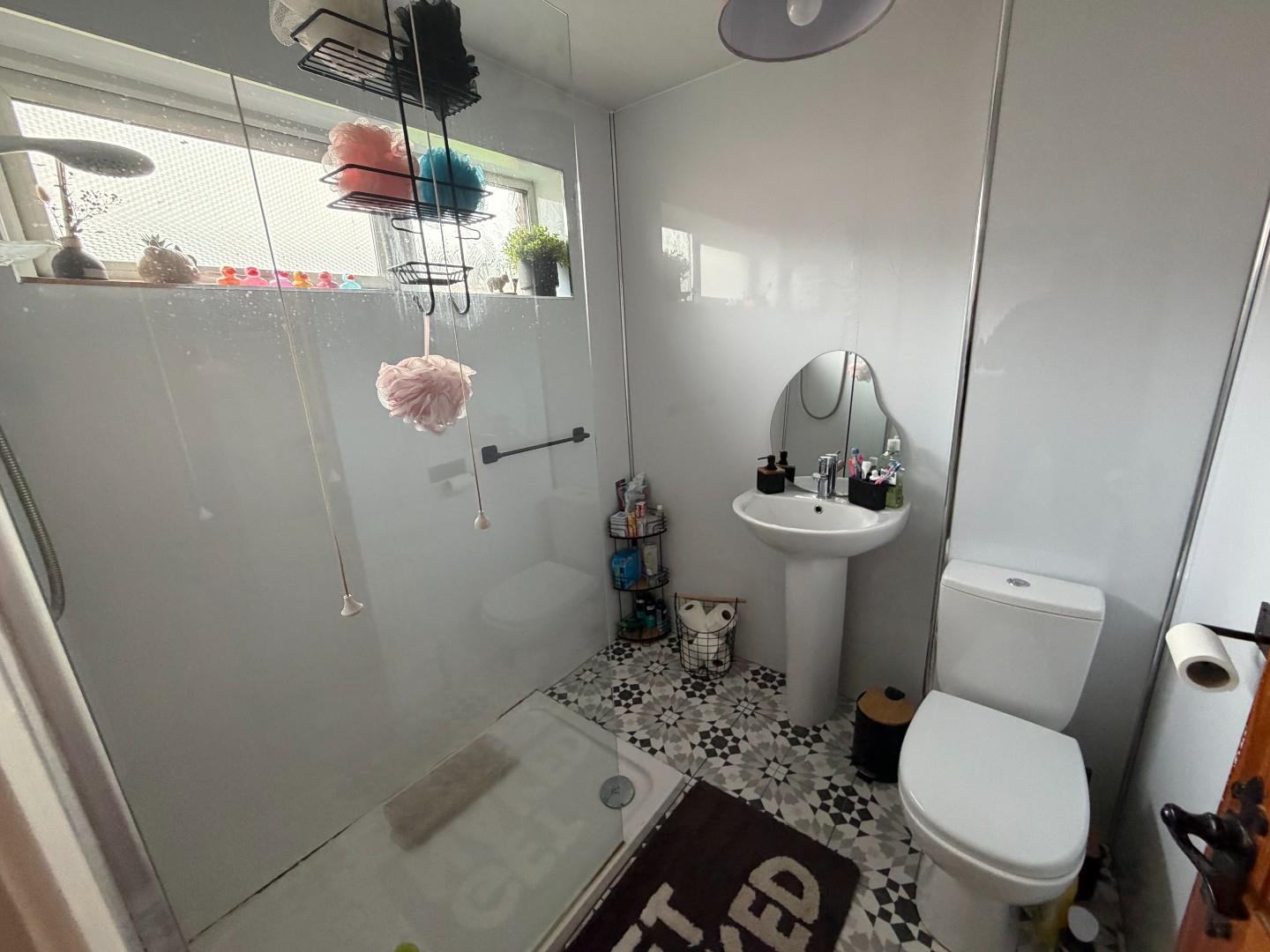 New suite with LFWC, pedestal wash hand basin, walk in shower with glass screen , fully paneled wall and floor, extractor, radiator.